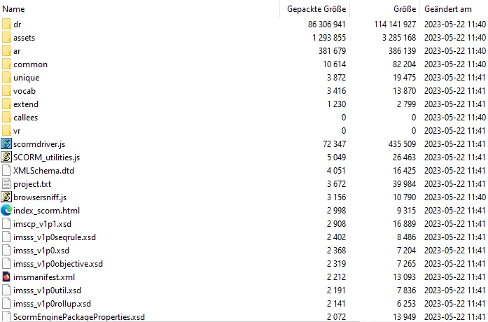 Wir haben ein E-Learning Modul bestehend aus mehreren Kapiteln erstellt. Beim Veröffentlichen stellte sich heraus, dass die zip-Datei mit über 800 MB zu groß zum Upload ins LMS ist. Daher haben wir für die einzelnen Kapitel separate cptx-Dateien erstellt, Videos und Fotos komprimiert, ein Kapitel auch mal ohne "Erweiterte Aktionen" veröffentlicht. Nun können wir die einzelnen Kapitel zwar ins LMS hochladen, aber die zip-Dateien erscheinen uns immernoch sehr groß und es entstehen Ladezeiten beim Aufruf im LMS. Was sind die json-Dateien in dem Ordner "dr"? Ein Kapitel hat in der cptx z. B. 26 MB, in der zip 86 MB; ein anderes in der cptx 75 MB und in der zip 99 MB. Woher kommt die hohe Differenz cptx zu zip?