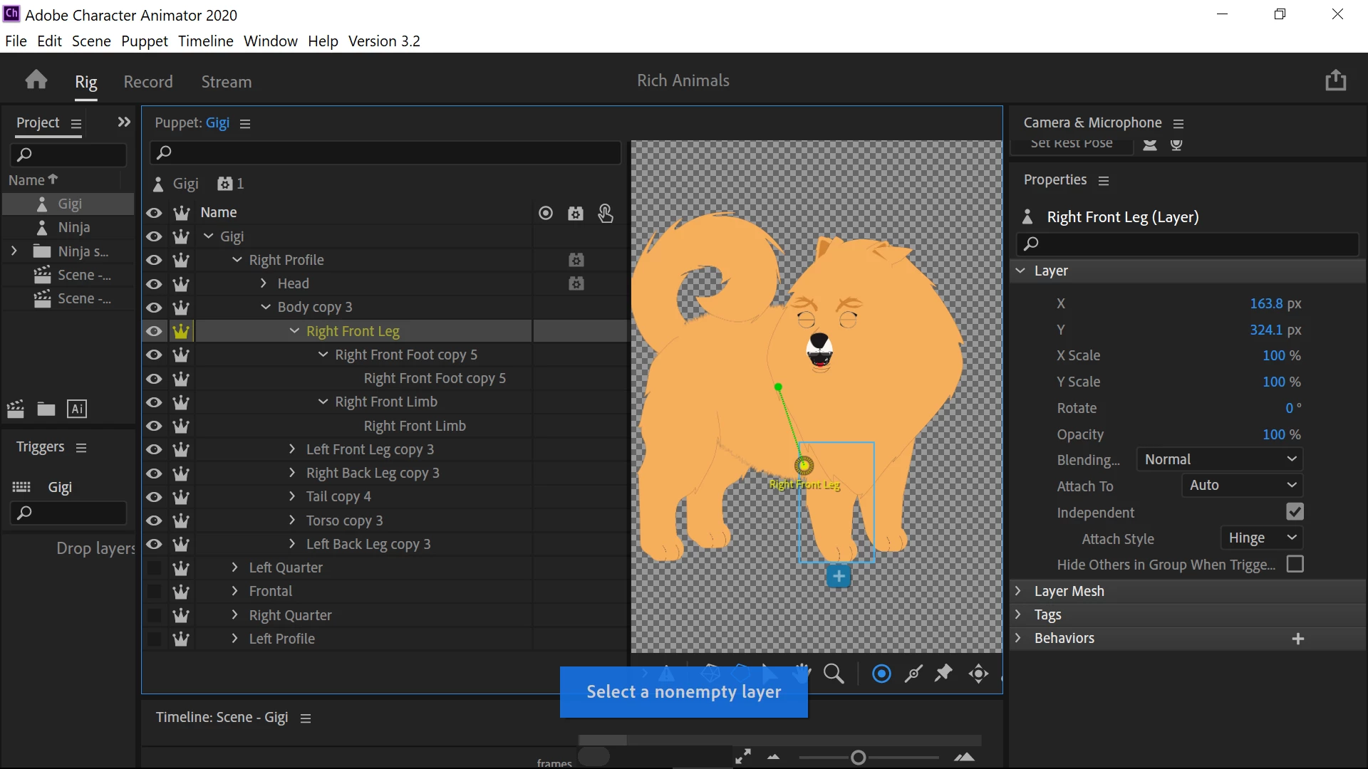 Im trying to add a walk behavior to a 4 legged character but I'm not sure how to do it if my character has 5 different body views. I also added a frontal view but im not sure if I can make the character walk from that view. I'm also trying to add handle tools to tag the Front Right leg but is not letting me because the layer is "empty". Any feedback will be appreciated,