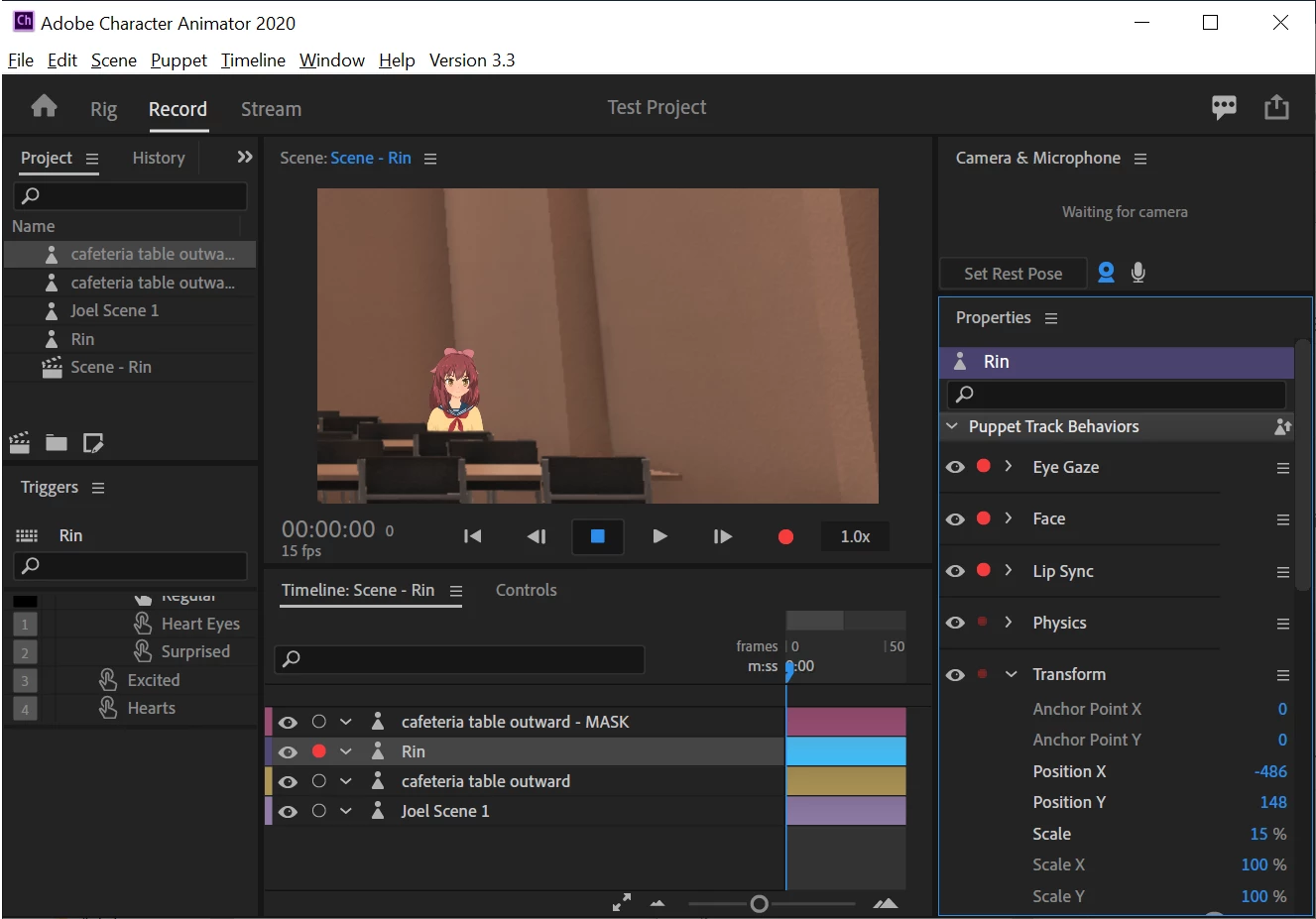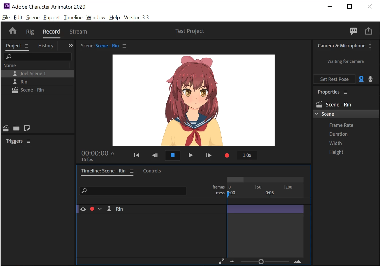 In the top left Project Panel you will see Rin with a puppet icon next to her and "Scene - Rin" which is a scene that Rin has been added to automatically for you.