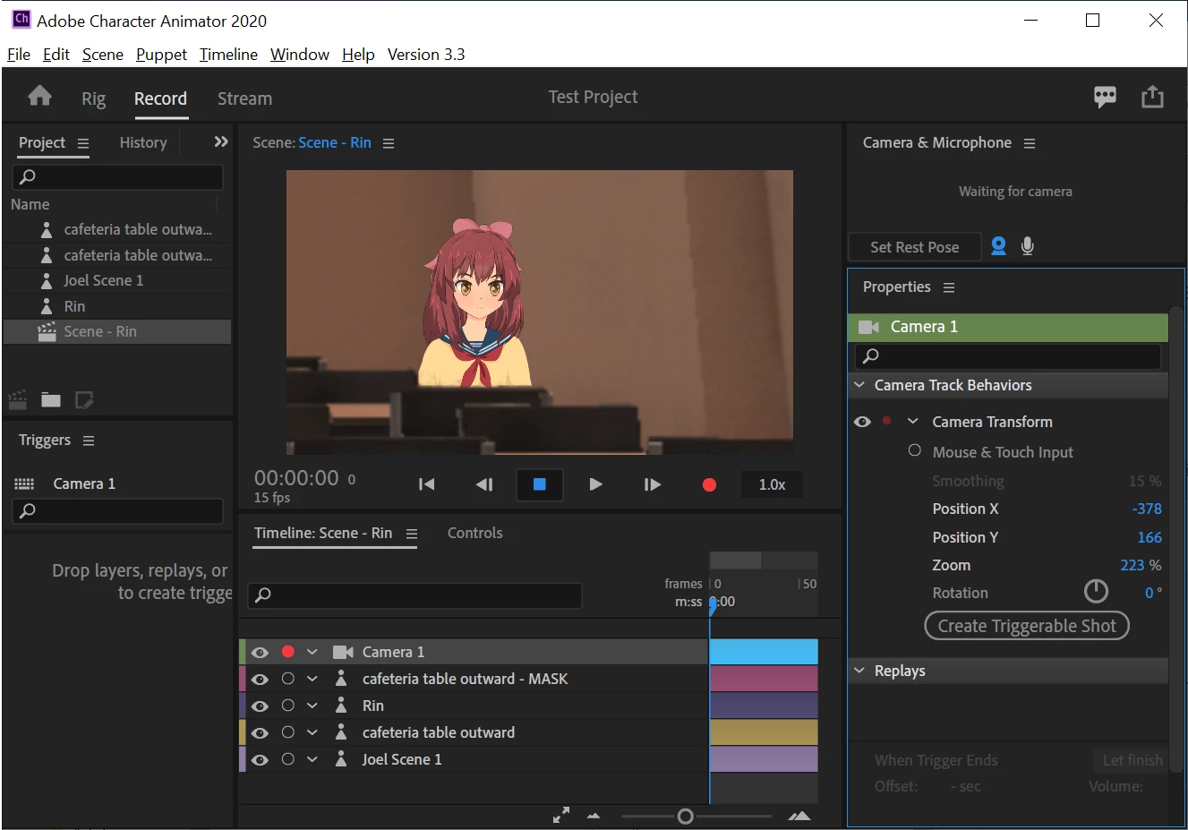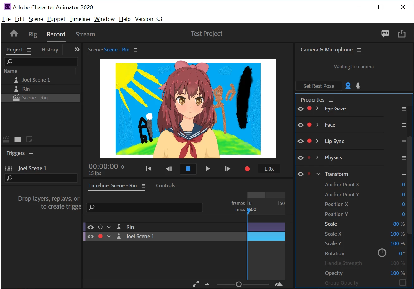 You can then do things like add a Camera (from menu, "Scene" / "New Scene Camera"). You can use the properties on the right (Position X, Position Y, Zoom) to focus on different parts of the scene. I zoomed in and fiddled with the position to make Rin look bigger again. This is where having higher resolution (or illustrator vector artwork which just scales perfectly, which is why I try to us Illustrator with CH as much as possible over Photoshop) helps. Zooming in can make pixelation visible. So you need to use high res images if you want to zoom in.