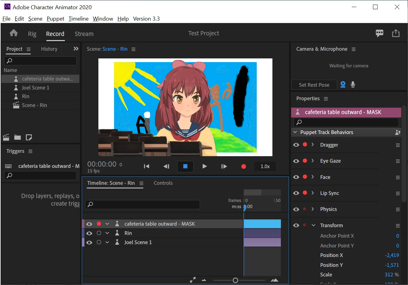 What I actually frequently do is take a scene shot (a caferteria in this case), then make a copy and mask out (erase) most of it in the copy. That allows puppets to walk behind that furnature. So my MASK file also has a non mask file. I write down the Scale, Position X, and Position Y values so they are identical for both layers. The puppet can then be in the scene better. Note I dragged the new background above Joel Scene 1 in the Timeline panel, hiding it (I should delete Joel Scene one from the timeline panel). Rin is now in front of the main background but behind the masked out foreground, so it looks like she is more in the scene.