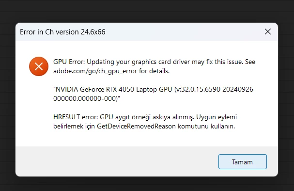 I’m trying to open Adobe Character Animator, but I’m getting an error like this. I’ve updated the drivers, but the result hasn’t changed. How can I solve this problem?
