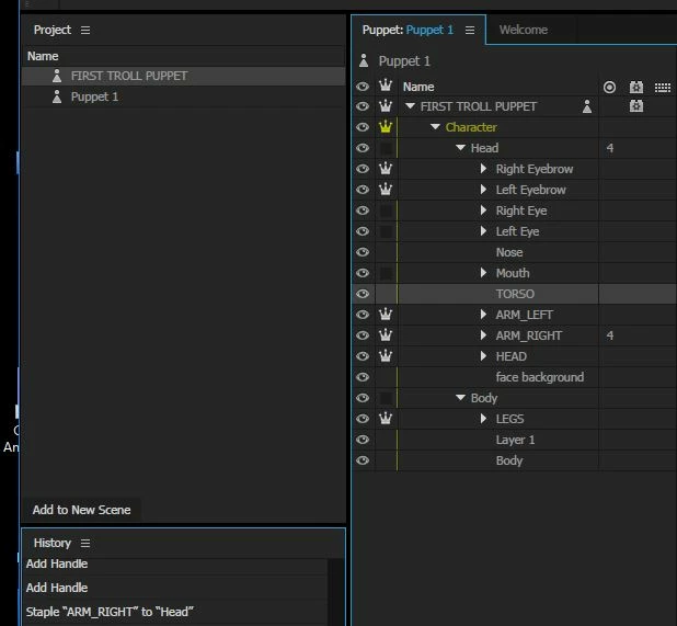 I've got my puppet (in the Adobe Blank Template) imported into the program. (At least it looks like the video tutorials). I attempted stapling the arms to the torso and installing Handles at the elbows, wrists and hands. But when I select an arm and try to drag it to a new position, the whole arm disassociates from the Torso. When I click on the Handle in the Hand and try to bend the barm at the elbow, nothing happens,