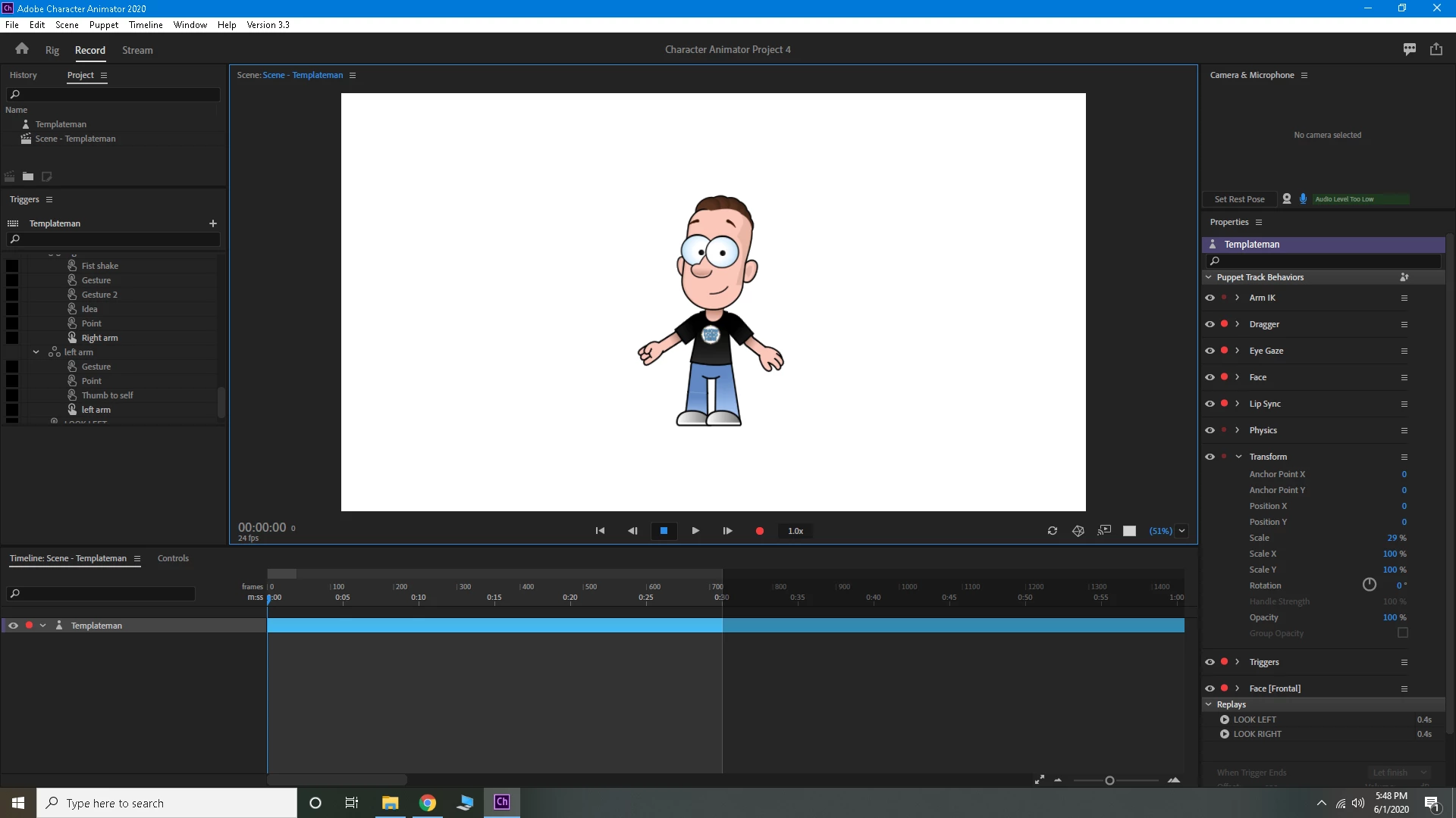 I start the program with the puppet, he is movable, and can have movement triggers. (1st picture)