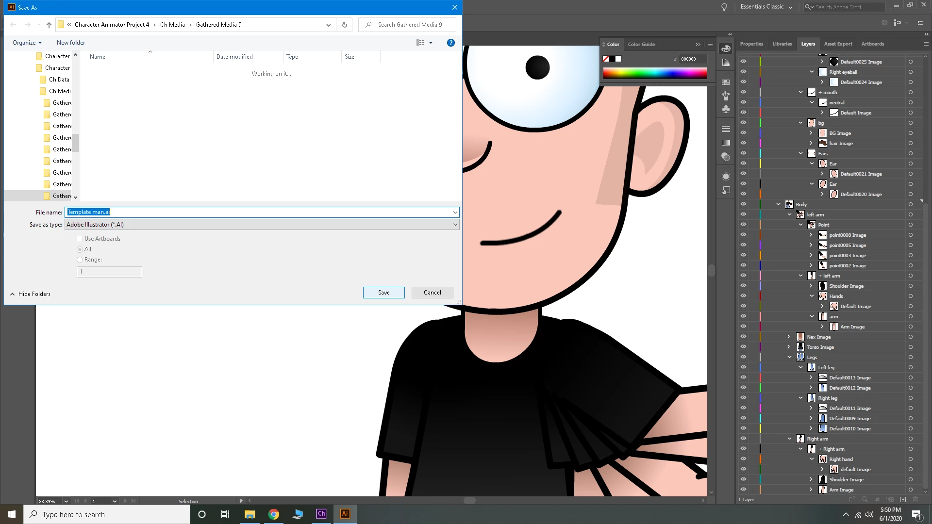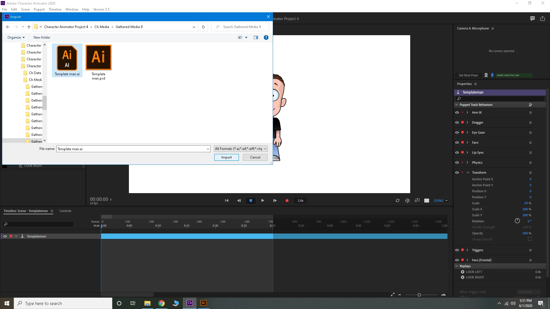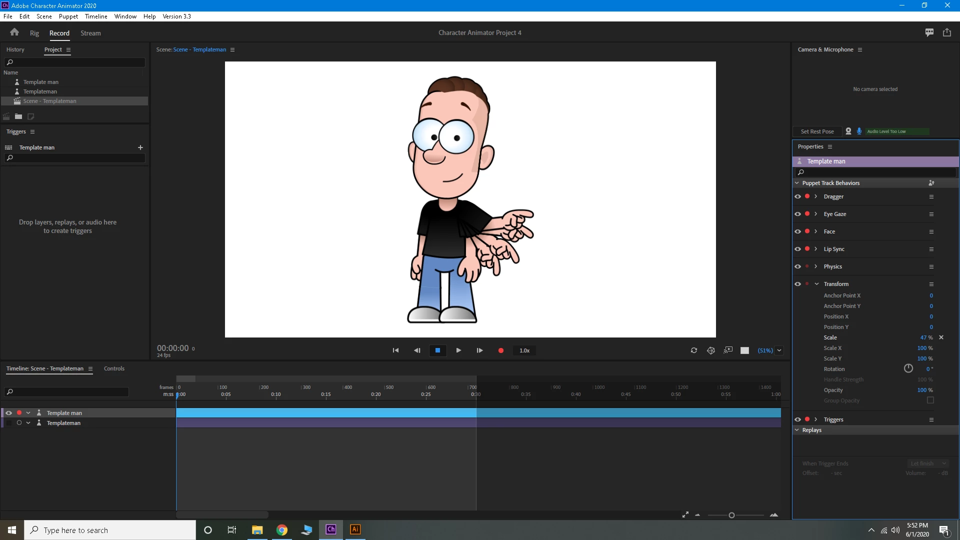 I go from record screen to rig screen, and this is what i get (picture 2) I click edit oriogional (pic 3) and it opens adobe illustrator (pic 4) and this is how it starts. (pic 5) shows exactly how the program starts. you can see I deleted the layer with the logo. I follow the instructions and click save (pic 6) which gives me a default area to save the character to (pic 7). after that i get the deafult illustrator option (pic 😎 which i click ok. (pic 9) shows absolutely nothing changes as shown in the videos and adobe instructions. so i followed another set of instructions which says to import the saved character i just changed (pic 10). and lastly (pic 11) shows what i get. a dead picture with no movement at all. I even tried adding drag points with zero luck. it just becomes a picture of what rezembles a multi armed picture. what is my issue here? I cant get it to works at all??? I have tries several different puppets, and same deal. I have also tried hiding the extra apendages before i bring the charachter into illustrator. same issues..