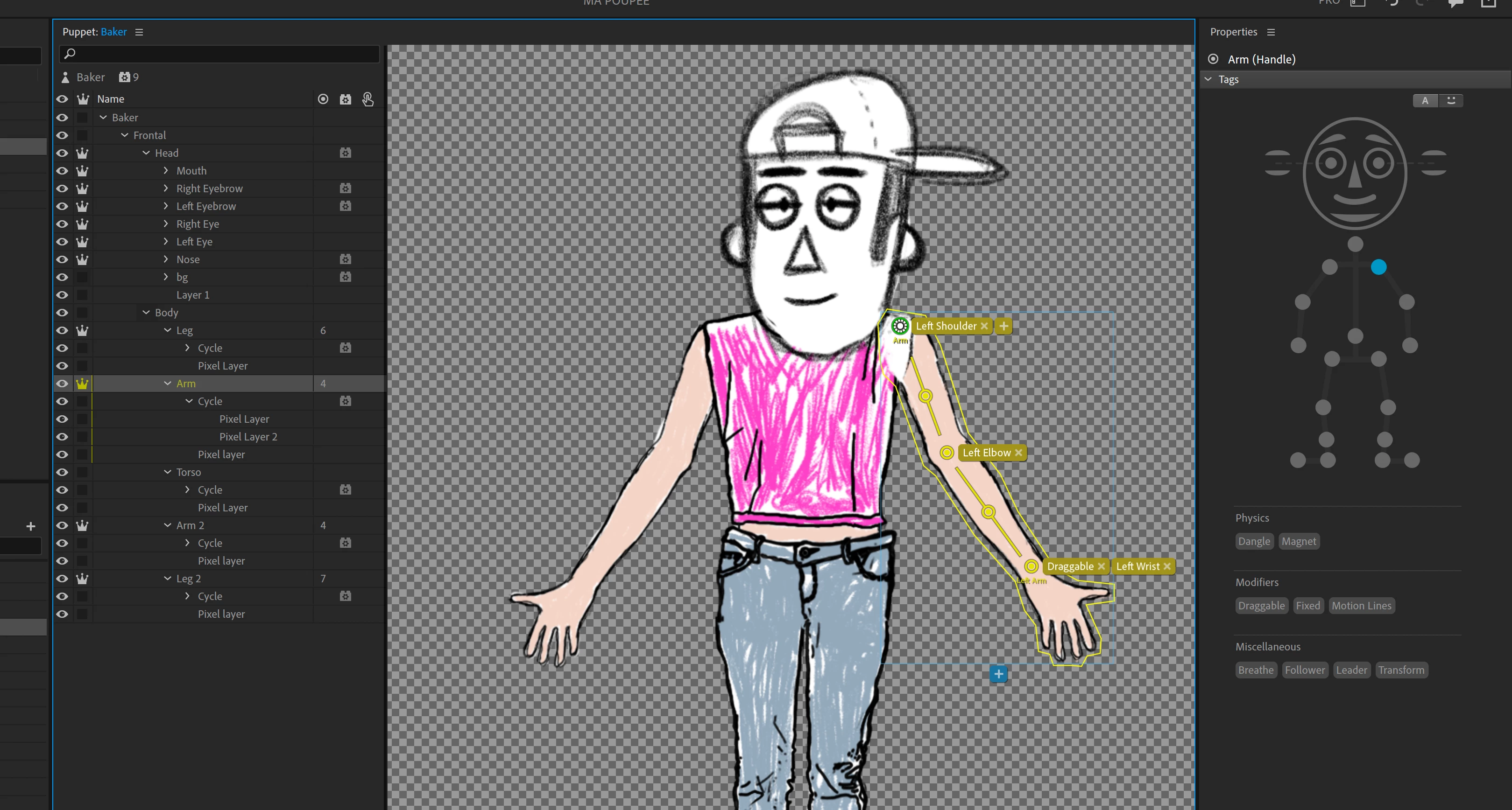 Baker might not be the best template because he is so Replay-based, meaning he has a ton of premade animations that are specific to his body type. Swapping in your own artwork probably won't work great, so I'd reccommend starting from scratch and using Baker's rigging as a guide for better results.