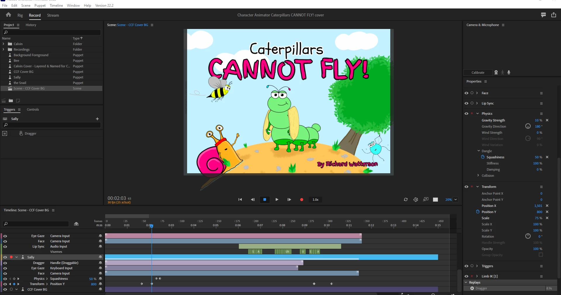 Hi, I am new to Character Animator and this is my first project. I am animating a children's book that I have written, illustrated and self published... anyway... I am looking to have a spider (sally) appear from the tree, bounce at the bottom of the web, and dangle.