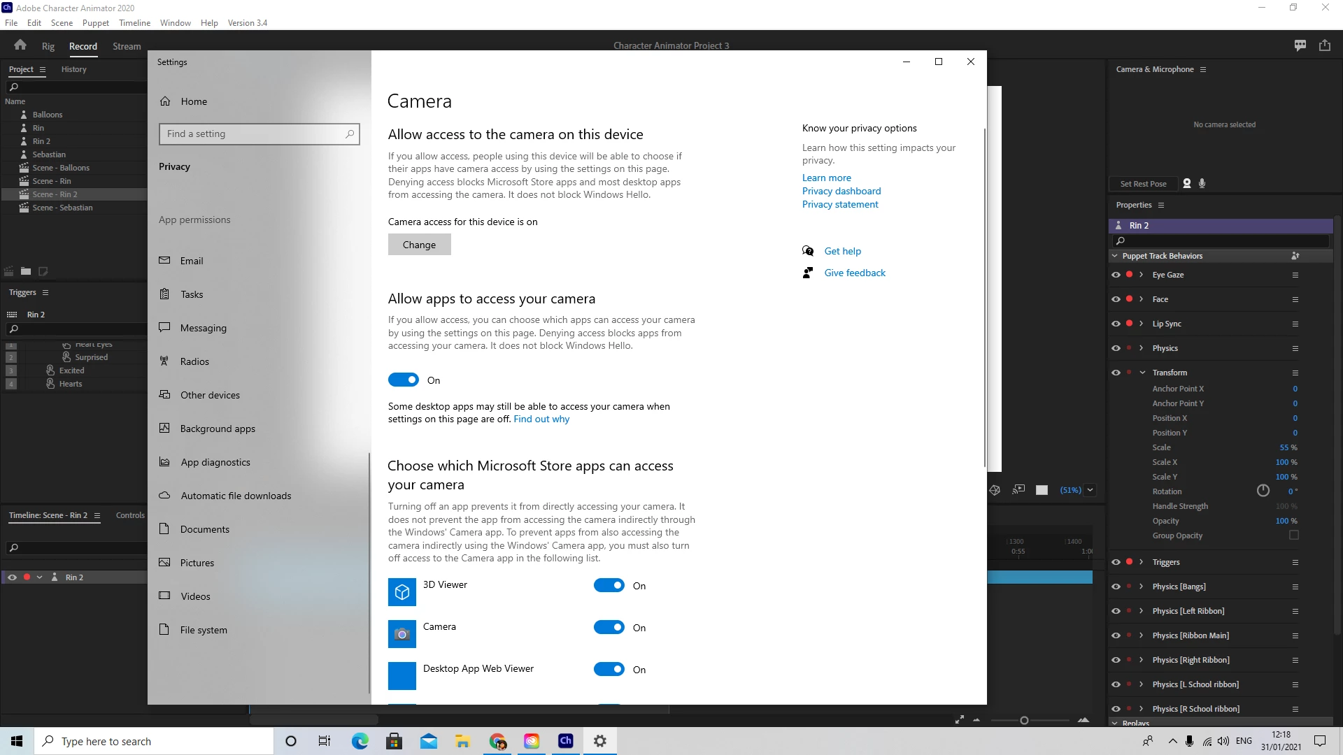 TTatiana5C5FParticipantForum|Forum|5 years agoFebruary 1, 2021QuestionCamera ONForum|Forum|5 years agoFebruary 1, 20211 reply494 viewsHello, can someone help me please? Character Animator dont see my camera, only microphone,thanksCamera