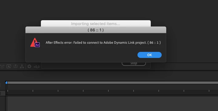 With AE 2019 i get an error message; Failed to connect to adobe Dynamic link project (86::1)