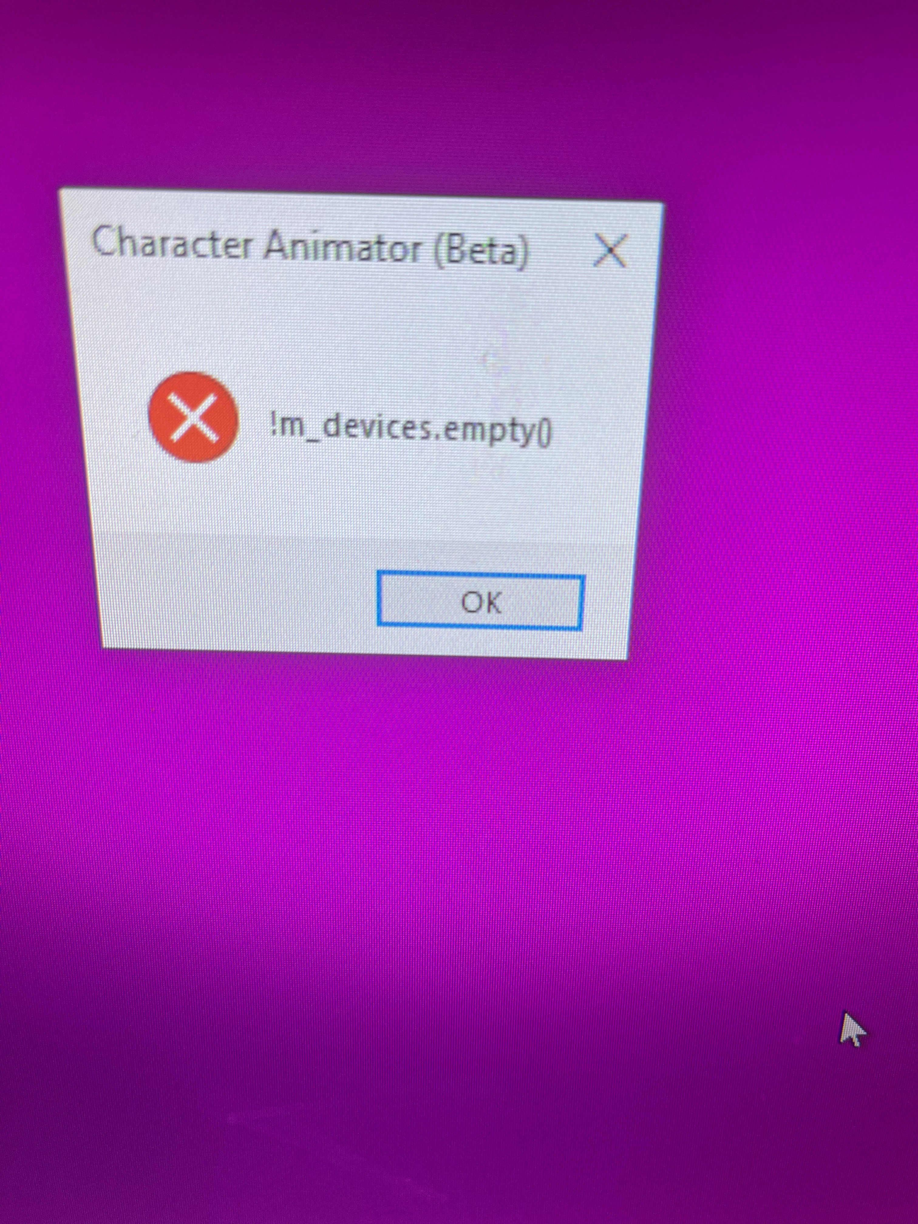 I downloaded and installed Character Animator (beta) today. When I try to run it, the splash screen comes up for a second, but then it crashes and give the error "!m_devices.empty()". What do I need to do to fix this?