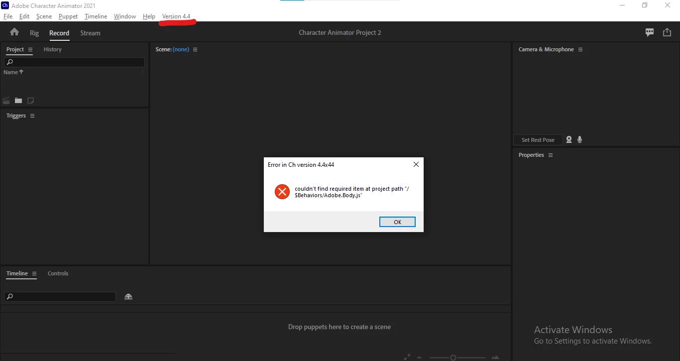 hi ive seen your viedo on youtube but when I try to open hopcotch or any other full body character it doesn't show me the body tracking icon I tried downloading from https://pages.adobe.com/character/en/body-tracker but I gives an error I will attack an image of the error below I've tried every puppet from the website but it still gives the same error  I am using version 4.4 when I try to update it say you are up to date with the latest version therefore i am not able to use the body tracking feature please help me with this