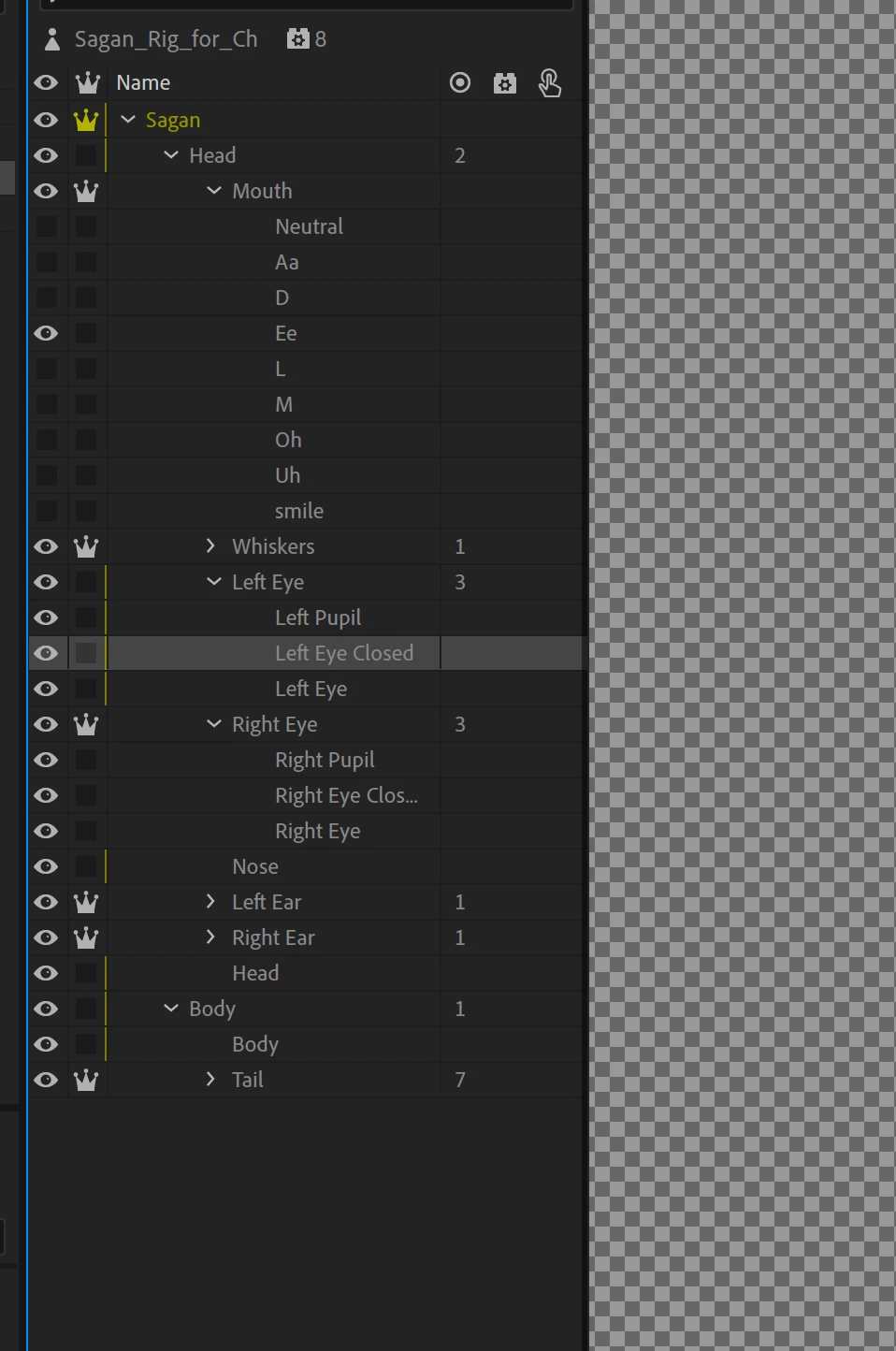 I'm new to Character Animator. I made a simple rig of my cat Sagan and everything works fine but the left eye. The big problem is at certain (and random head positions) the left eye folds in on itself. The pupils are not tracking either, which is a lessor concern at this moment as I could just use the mouse to move them later. But I feel like I've tried everything and can't get that left eye to work correctly. He blinks just fine. They are attached to the torso, set to weld, tagged correctly, the "Show Rigging Issues" function just says no behaviors are attached to the eyes, but when I tried adding Eye Gaze, it made it worse. BOTH eyes started folding in on each other. See screen grabs below. Any suggestions would be amazing.