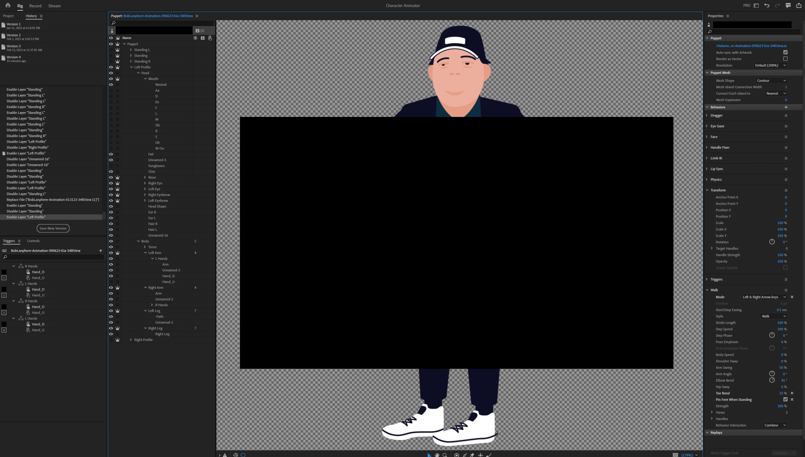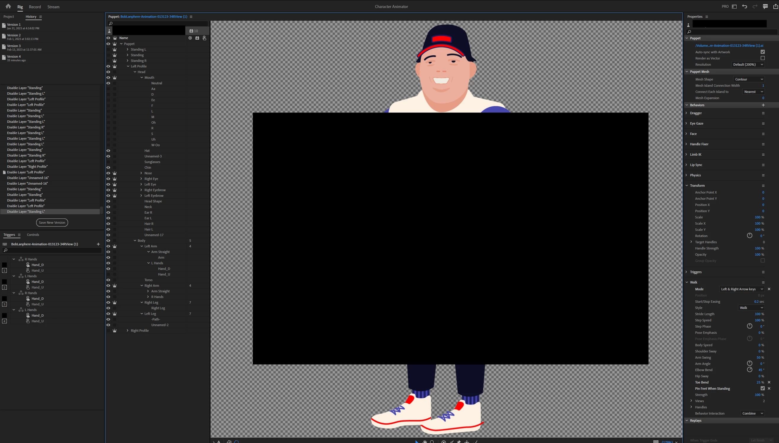 To add - I created a 'Standing L' and 'Standing R' layer by duplicating the left and right profile for the original walking feature. These layers are now missing serious parts of the puppet. I'm not as worried about this as I am about the mouth/ saving time rigging.