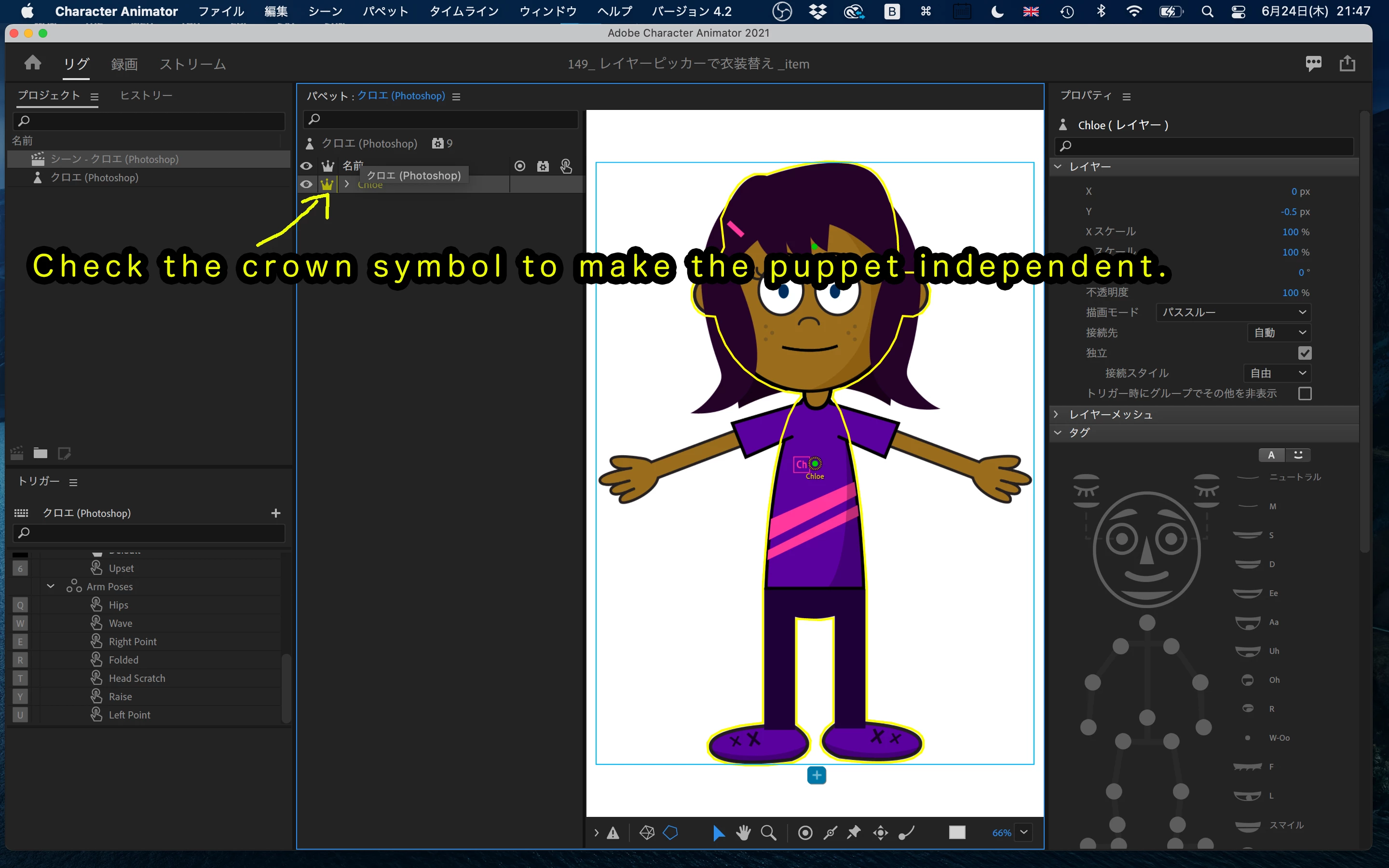 You probably don't have the crown symbol checked in the whole puppet layer.