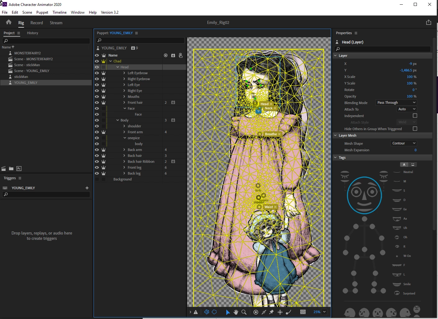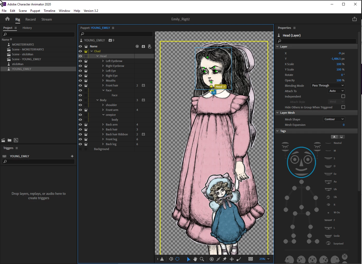 First thing to understand is when a new mesh starts, which is pretty easy. A new mesh is started whenever a layer is marked as independent. So you head (with no crown) is not independent is a part of the parent mesh (the root of your puppet). That is, the Head and Body are part of the same mesh. The eyebrows are independent, so start a new mesh. Clicking on any layer in a mesh will show the same outline (the outline for the mesh the layer is a part of).