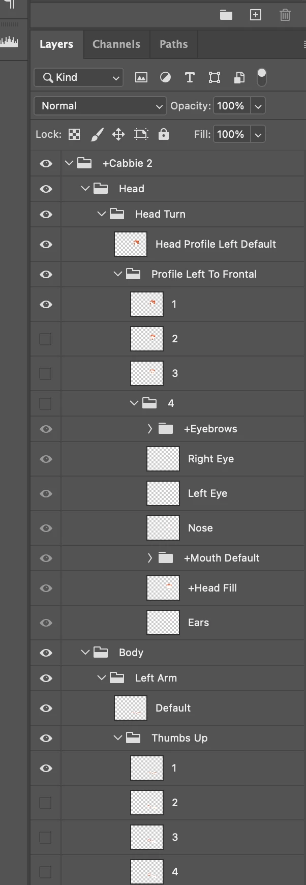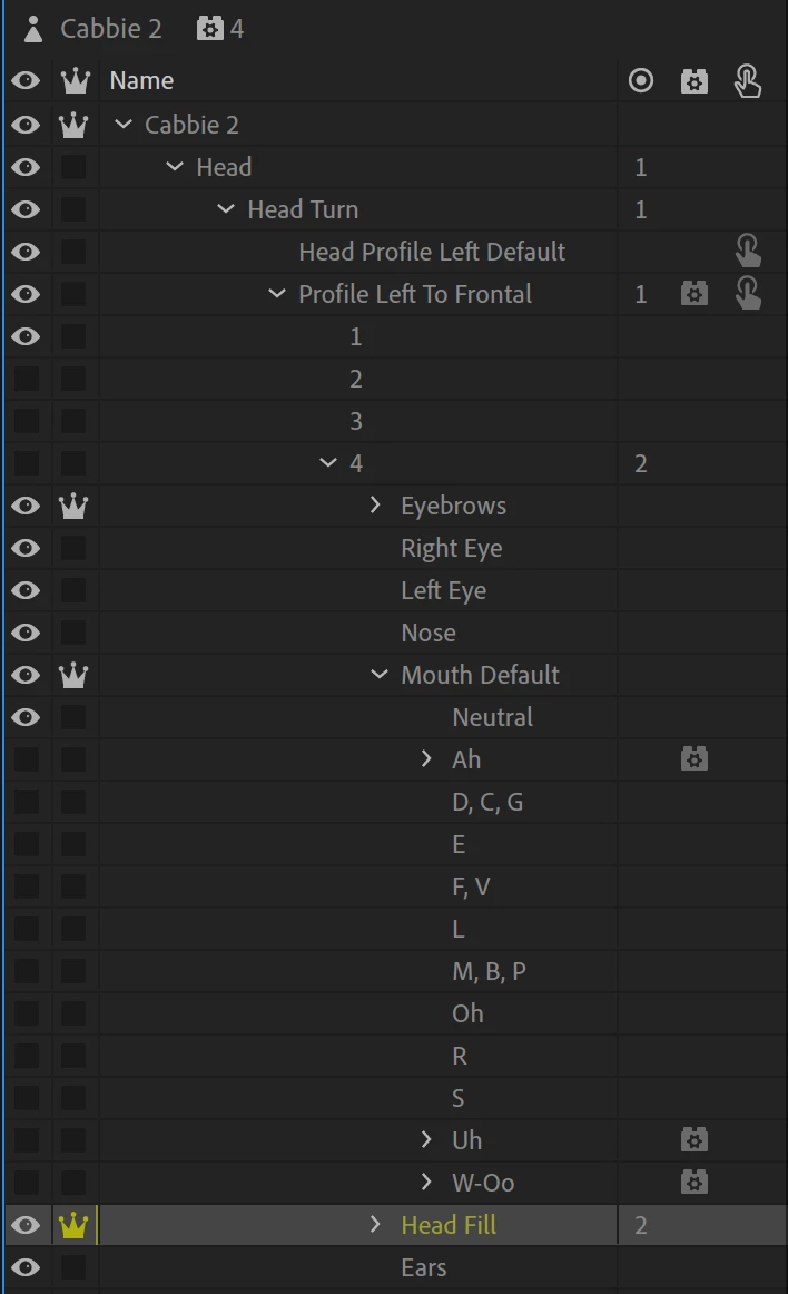 The only difference is that the last layer, the Frontal View, is animated. This has been put into a folder with mouths, eyes, nose, etc. The Frontal View is the only frame/layer in the cycle tagged as "Head" and "Frontal Head" on the mannequin at the right in Rig mode because it is the only layer being animated. Everything appears to be labeled/coded correctly. Layers hidden as necessary. I'm surmising my hierarchy is incorrect.