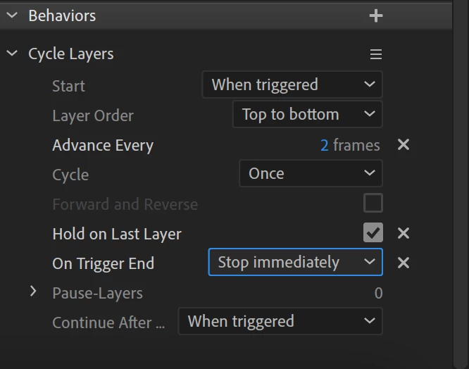 The head turn is similar to the left hand cycle. It is grouped with a default layer and the cycle group. It is set up as a Swap Set with the Default Layer marked as "Default" and balance of the cycle group marked with "Latch" box checked. My cycles Behavior is "Hold On Last layer" and "Stop Immediately".