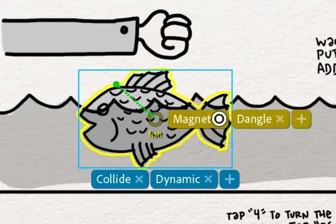 The easiest way to reproduce this is to download the OkaySamurai magnet puppet example, then just add a "magnet" handle on the fish.