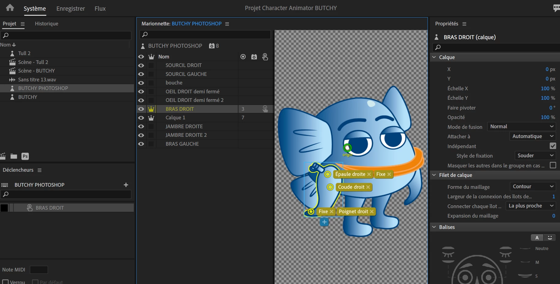 Bonjour, je ne comprends pas pourquoi quand je mets une partie du corps (par exemple "Bras droit") dans le panneau déclencheur, elle disparait dans le panneau scène?