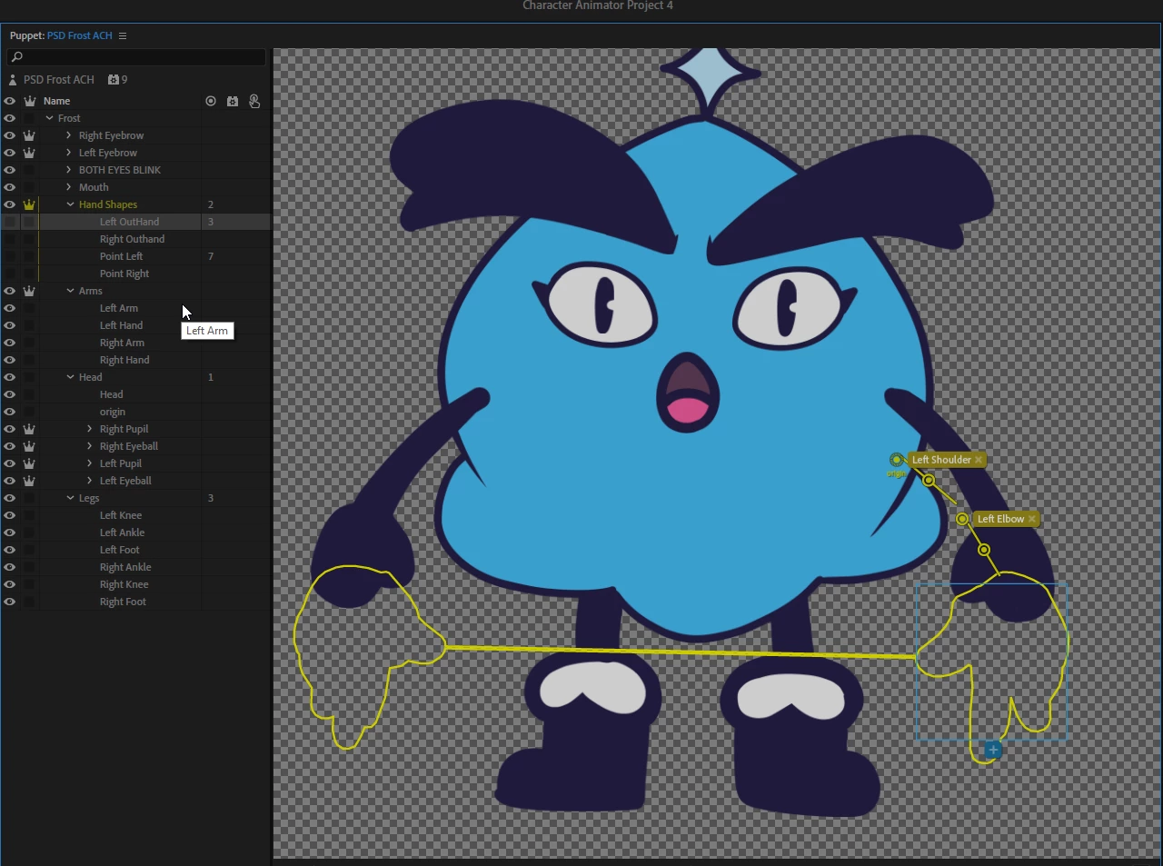 In Character Animator, I had points for the shoulder elbow wrist rigged on my puppet.