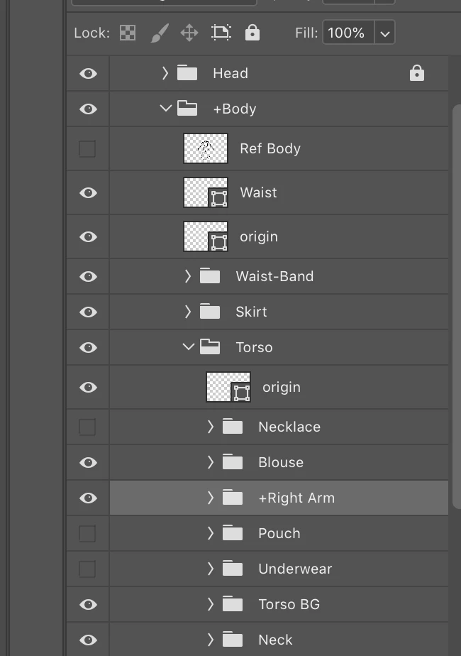 However, in the Right Quarter view, I had to put the "Right Arm" within the "+Body"/"+Torso" layer (the Torso is a Group within the Body). I had to do this to keep the order of layers such that they overlap correctly. I have attached a screen grab of the "Right Quarter" layers.