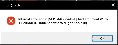 "Internal error code: (1431844275:478+8) bad argument #1 to 'FindTabByID' (number expected, got boolean)"