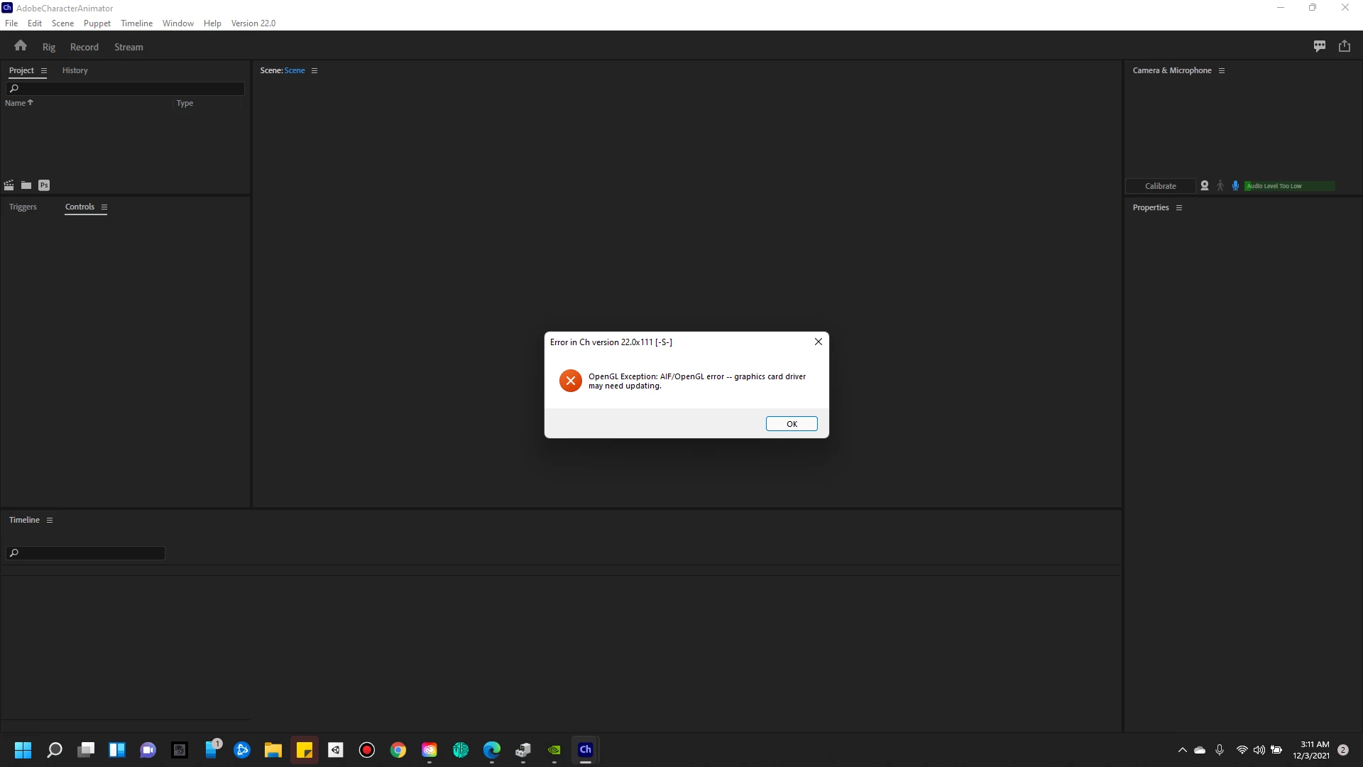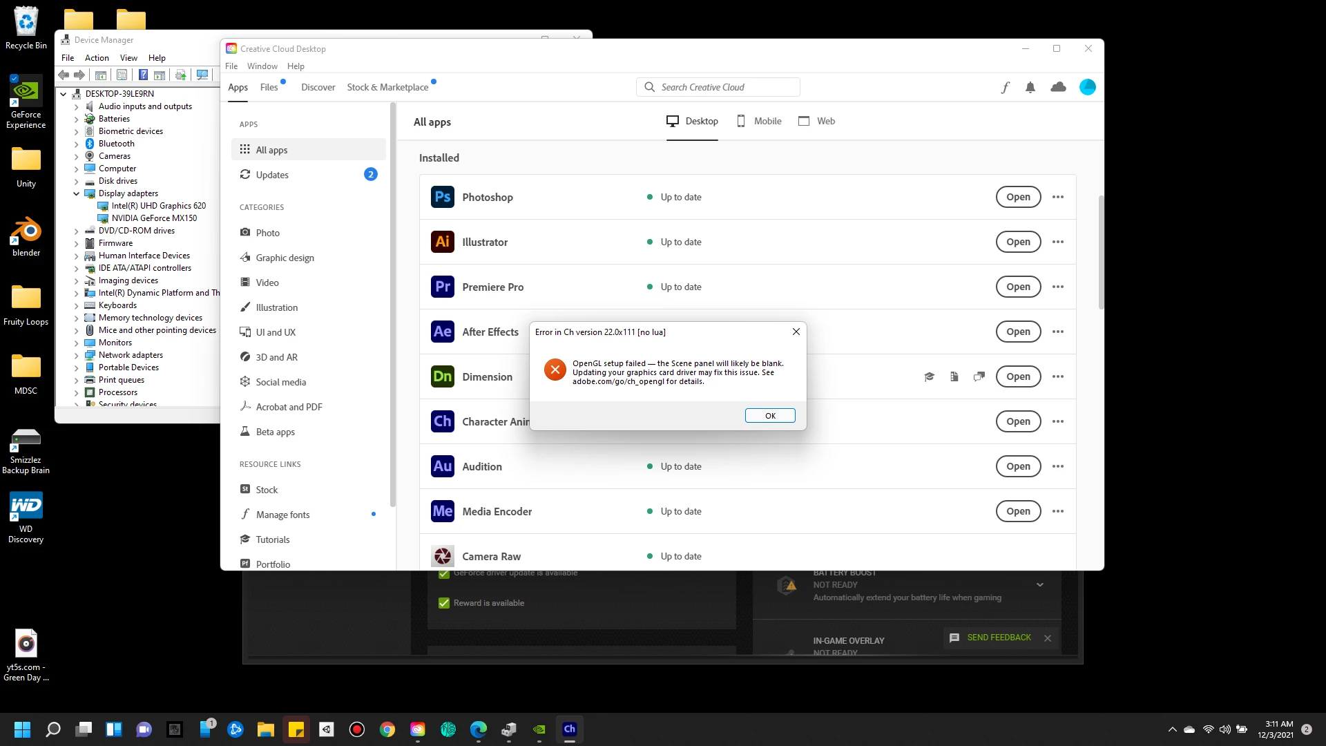 I am going too be 100% honest. I was running 3 programs at once. Adobe Illustrator, Adobe Character Animator, and World of Warcraft. Both Adobe programs crashed on me while I was importing a puppet into CH. Since the crash, whenever I tried to re-open CH I would get an error telling me to update my gfx driver. Fine. I did. And it didn't help. Can someone please help me figure out how to solve this issue please?
