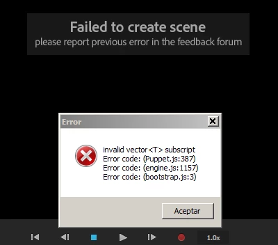 I have tried creating a new scene and dropping this puppet into it, but the same error occurs. I can add other Illustrator puppets to the scene, though.
