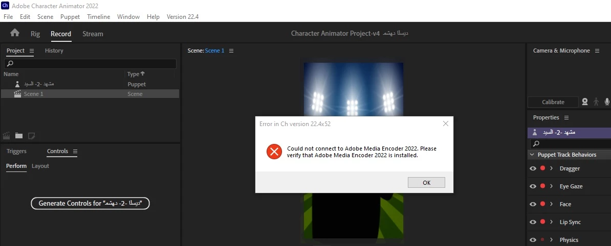 I installed Character Animator 22.4 and also Media Encoder 22.4 But error appear when I export my project