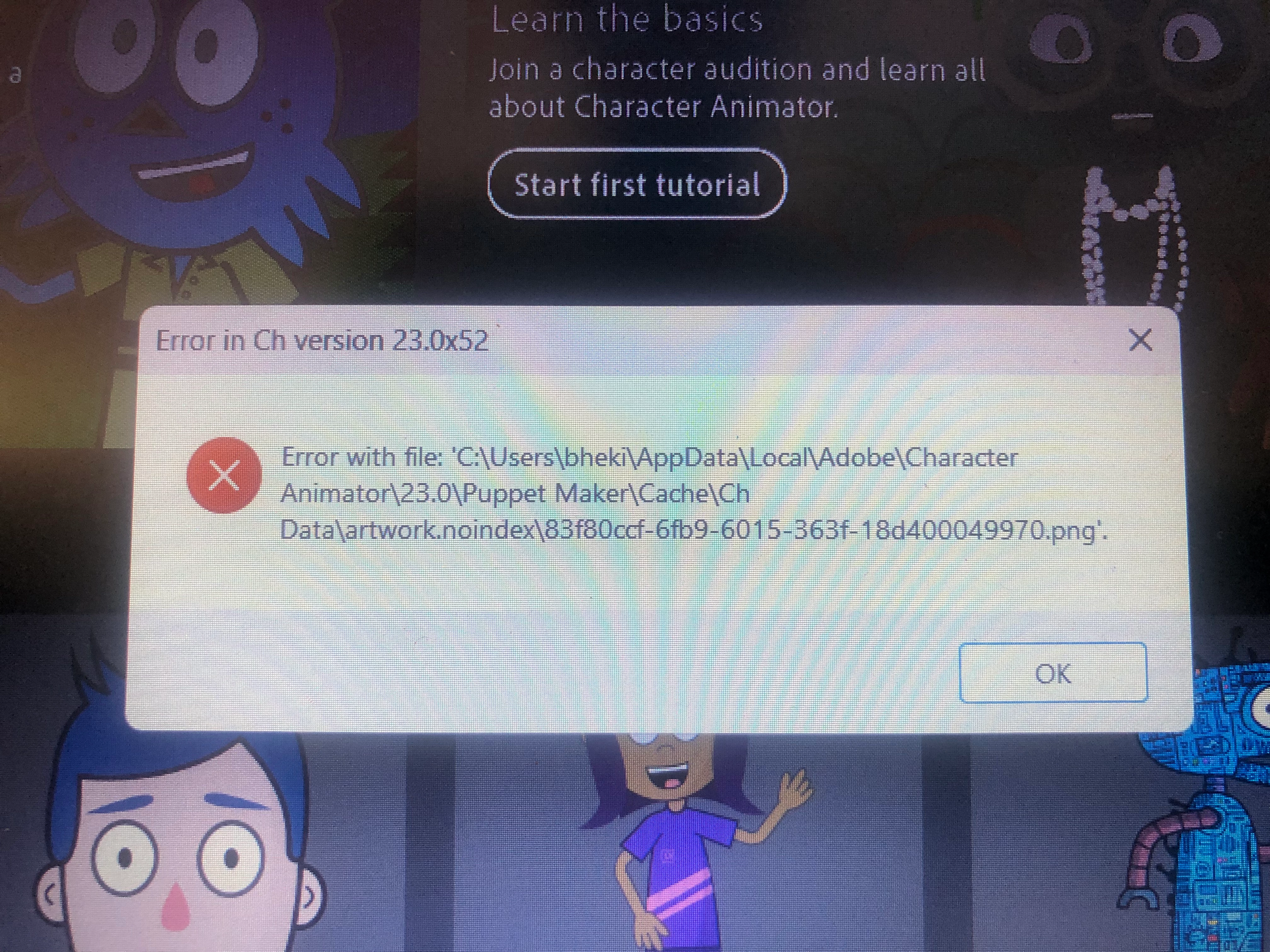 I installed Character Animator a week ago on my Windows laptop. It was working fine until yesterday when I was opening Puppet Maker and I got an error. I've attached the image of the error. I've since uninstalled and reinstalled the latest version, installed version 23.1 and I'm getting the same error. I've also tried following the suggestions from this forum, such as holding the alt key when opening the app, holding the shift key when opening Puppet Maker and creating a zip file of the Character Animator folder. Nothing has worked. Please help.