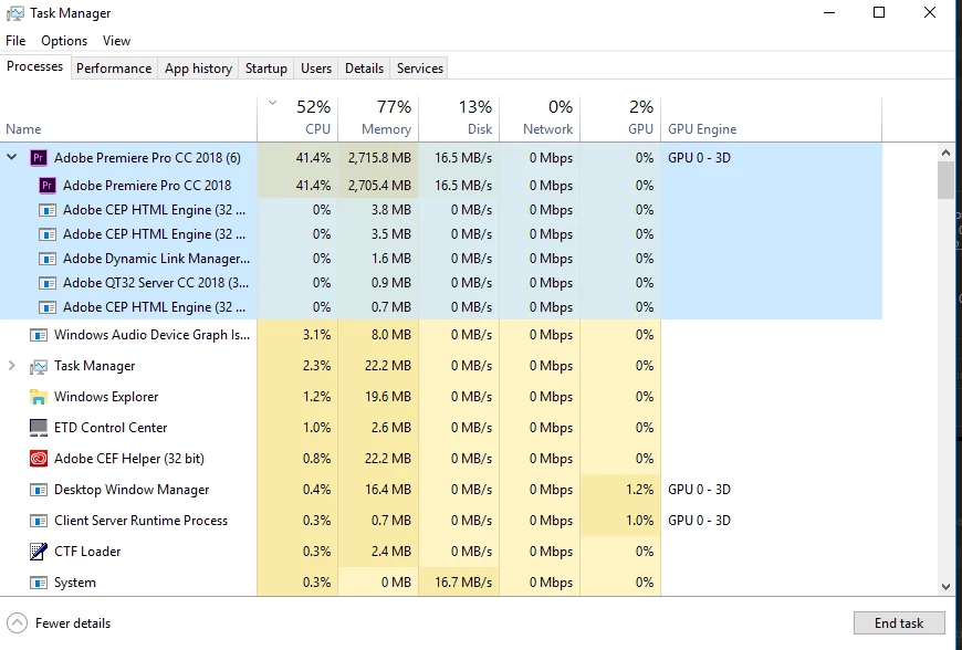 If we trust the task manager everything works well but that causes a deadly slow down in my entire computer every single click takes forever and this is driving me crazy since I just bought it especially for this kind of work. No virus I use another laptop for the internet.