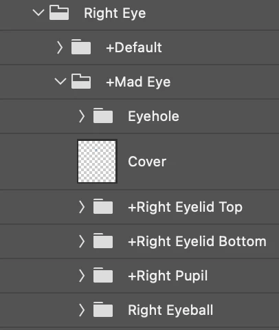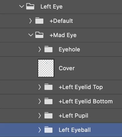 I am working on a puppet and have managed to get the default set of eyes to work and am trying to add another set of eyes to be able to convey more emotion. I am using top and bottom eyelids instead of a blink state. The new eyes that I am working on are supposed to convey anger so I have the bottom lids slanted a bit. When put into character animator I get no response from the eyelids as well as the pupils. I am hoping somebody could enlighten me to whatever mistake I am making. Attached I have put an image of the eyes I am trying to make work as well as the layers.
