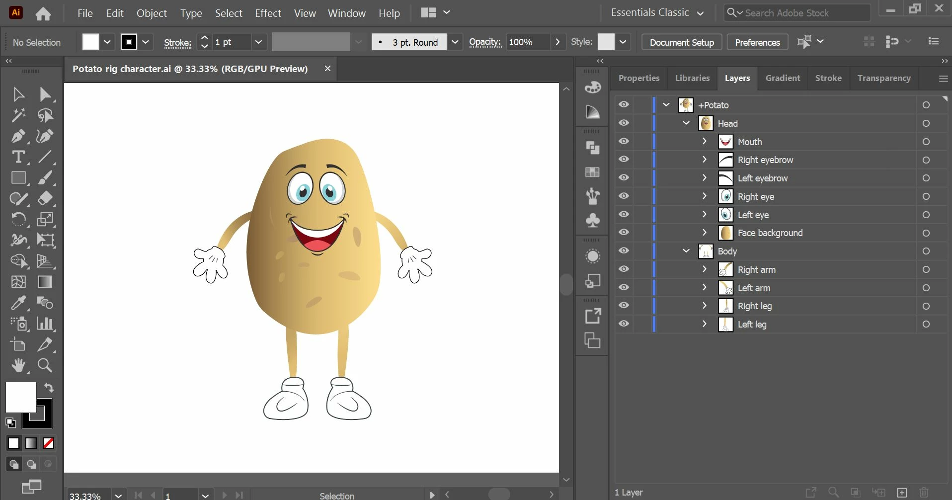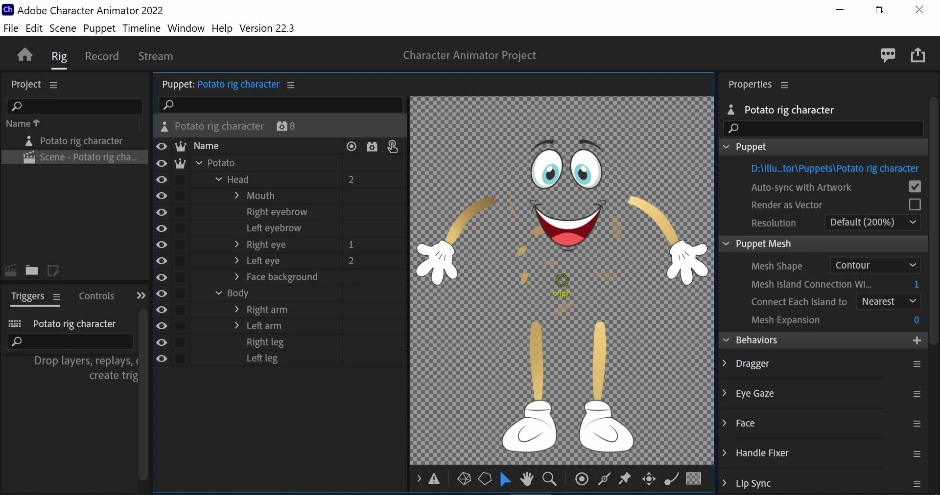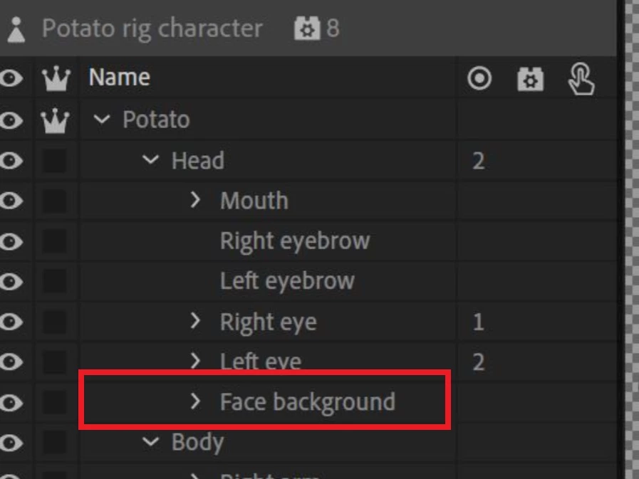 Hello there, hope you will be doing great. I have an issue with the rigging of a new character. This is a simple potato character having only a head and limbs no torso. When I import the file in the character animator, the face background didn't show there. Please let me know how to fix it, is there any issue with layers or this is something else? Screenshots are given here. I am using adobe illustrator 2020 and adobe character animator 2022.