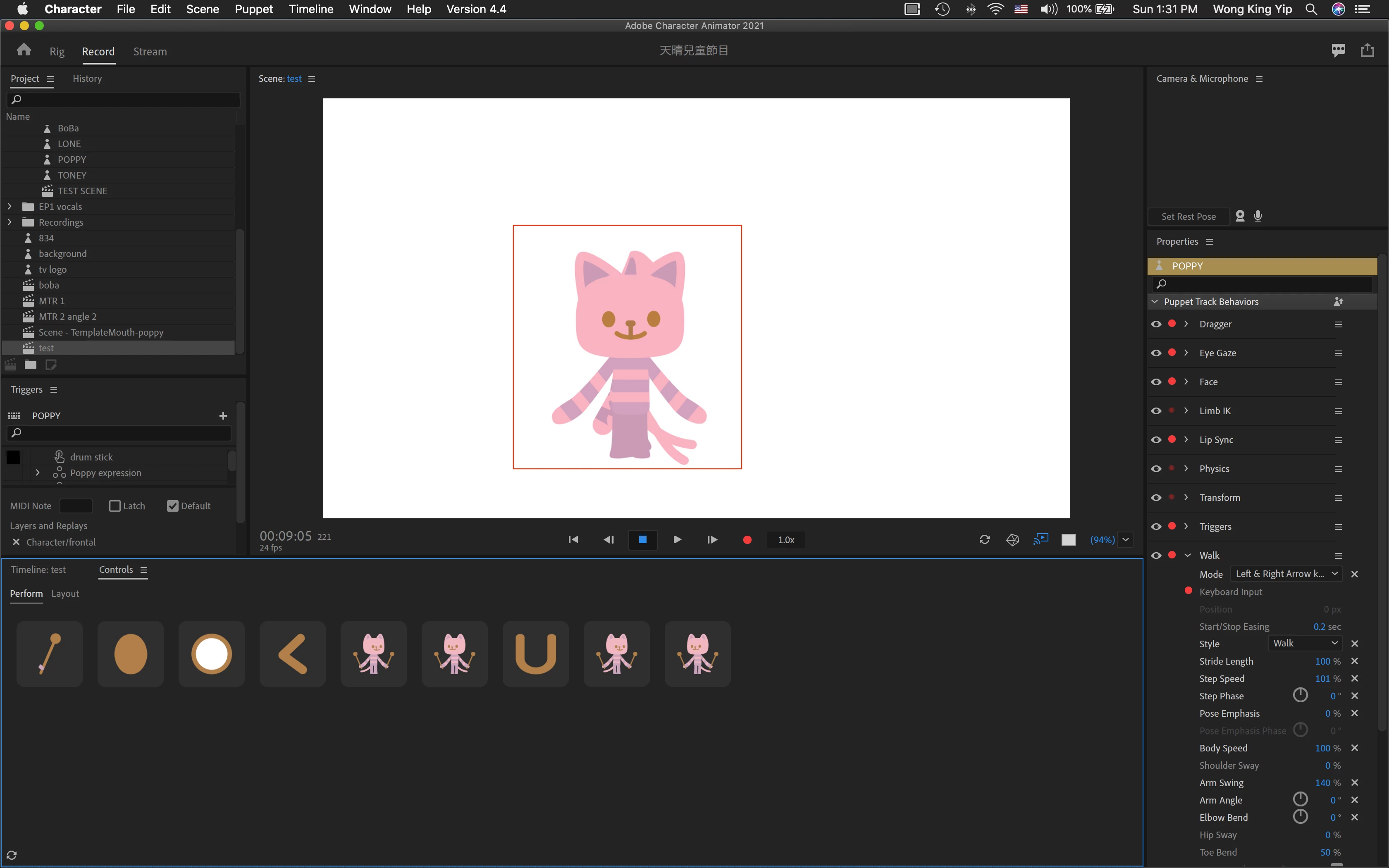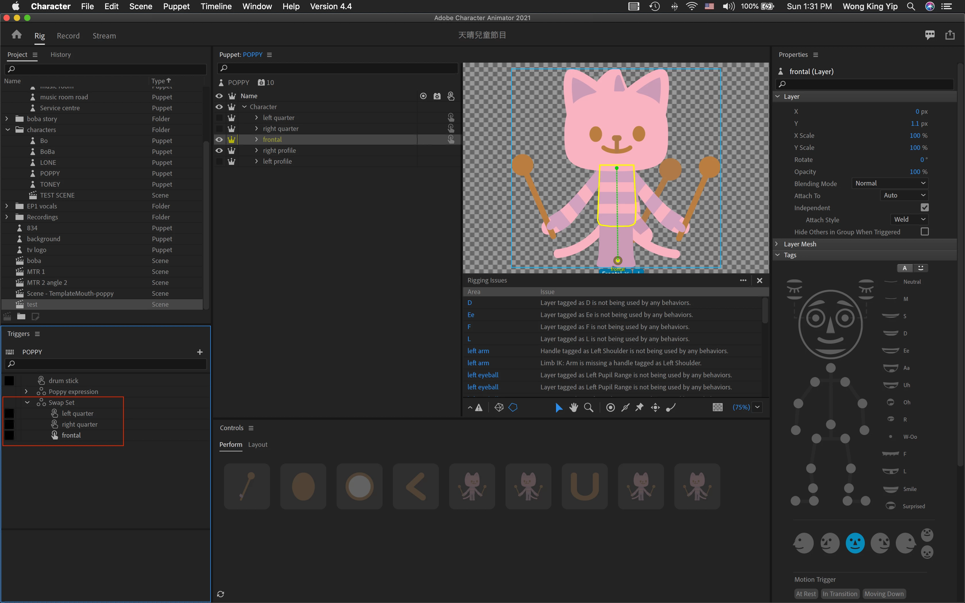 I have a puppet with all 5 views. the walking is just fine. but when i add a swap set on different views(pic 1), when i try to walk it, the default frontal view sticks with the walking animation (pic2).