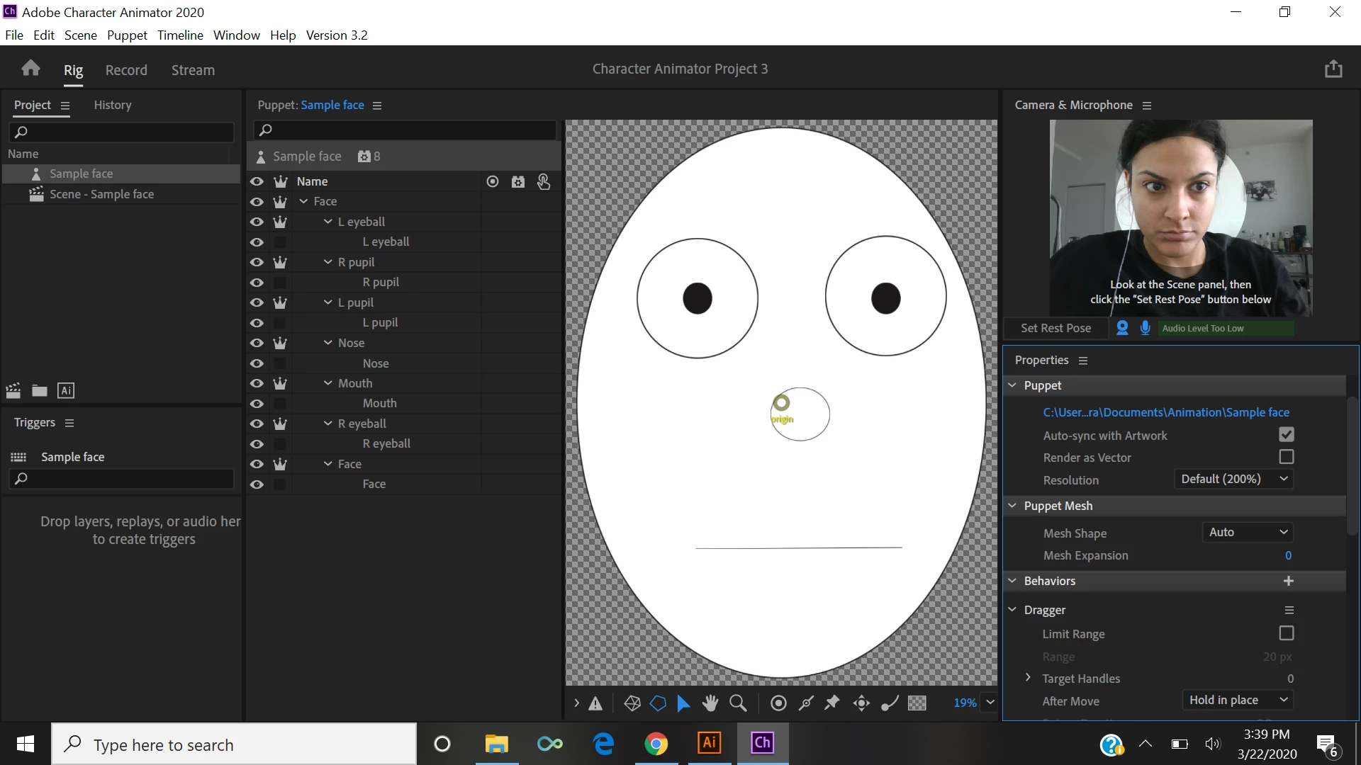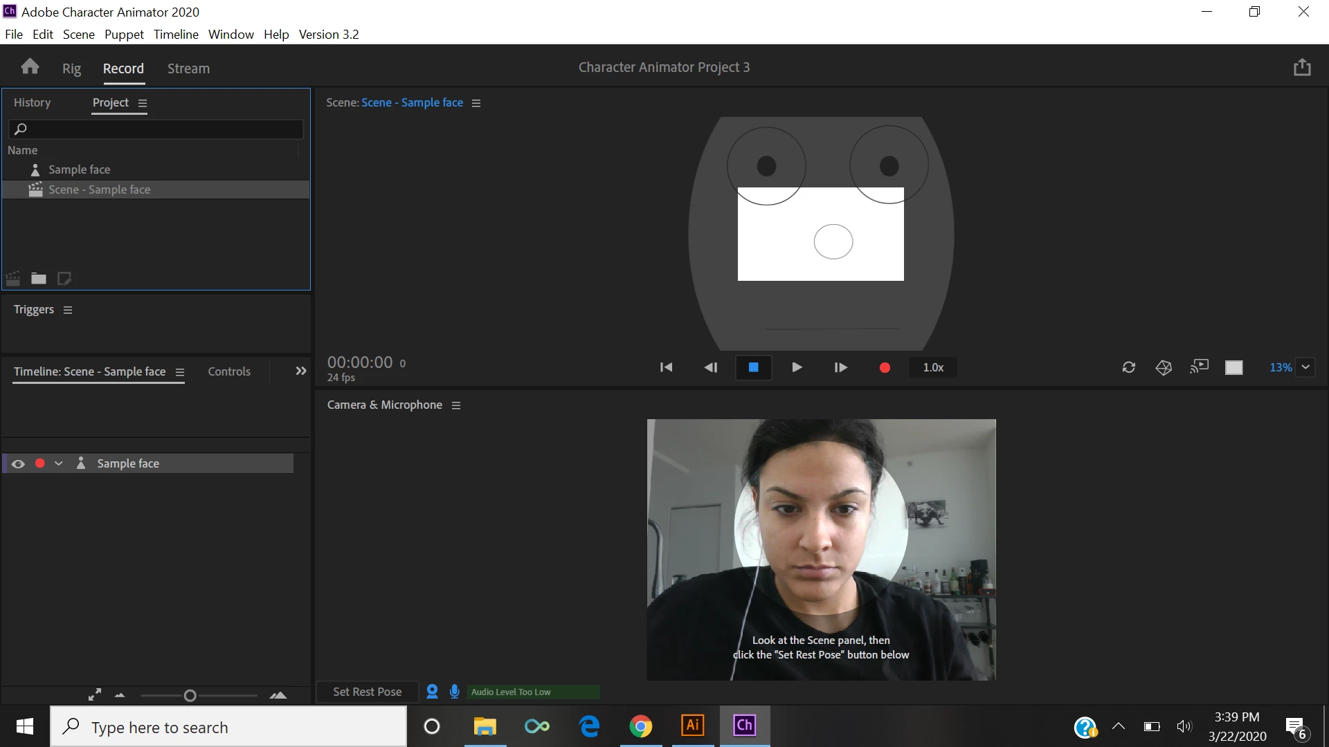 Im new to Character Animator and I created a simple face to practice with the chamera tracker. I dont know how to set the face to follow my face moves on the camera and there is a weird rectangle on the puppet everytime I click on scene. Ive been looking for tutorials but none of them explain how to do this or I dont know if the face is supposed to start moving as soon as I import it. The camera and microphone seem to be working fine. Attached there are pictures of the view of the scene and the puppet. Any help will be appreciated, Thank you