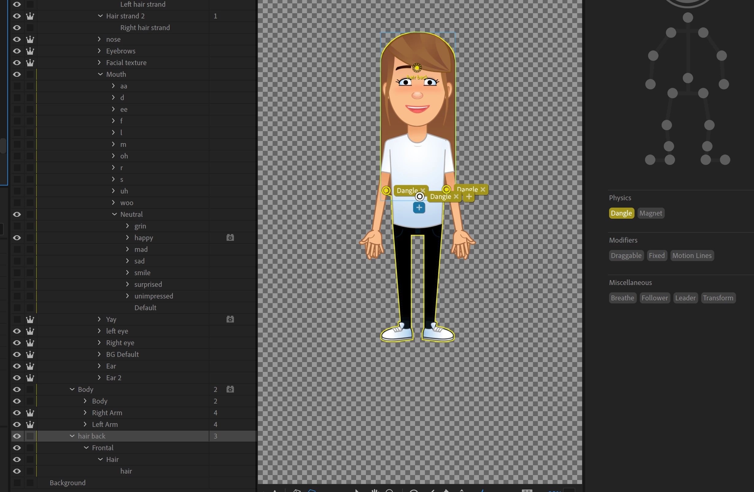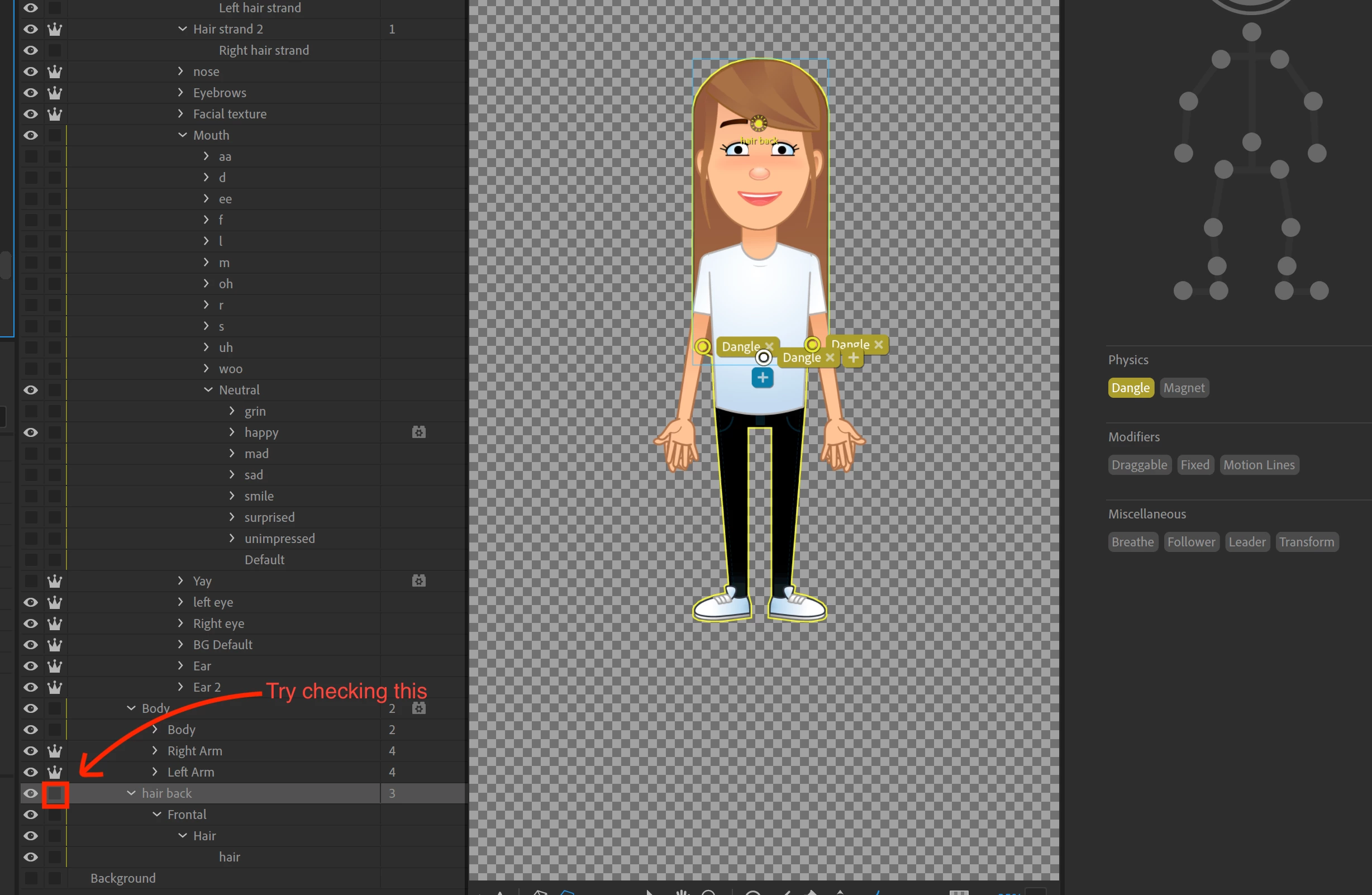 Hi everyone, I'm having problems getting the Hair Back my character to dangle. There are a few sublayers — none of which seems to be different, meaning if you disable the top Hair Back and disable the bottom Hair layers, it disables the same thing. I have applied the dangles to the top layer and moved the origin to her forehead. I'm also confused because each sublayer has another orgin. Regardless which orgin I move, it doesn't light up green. Any help would be greatly appreciated. 🙂 - David