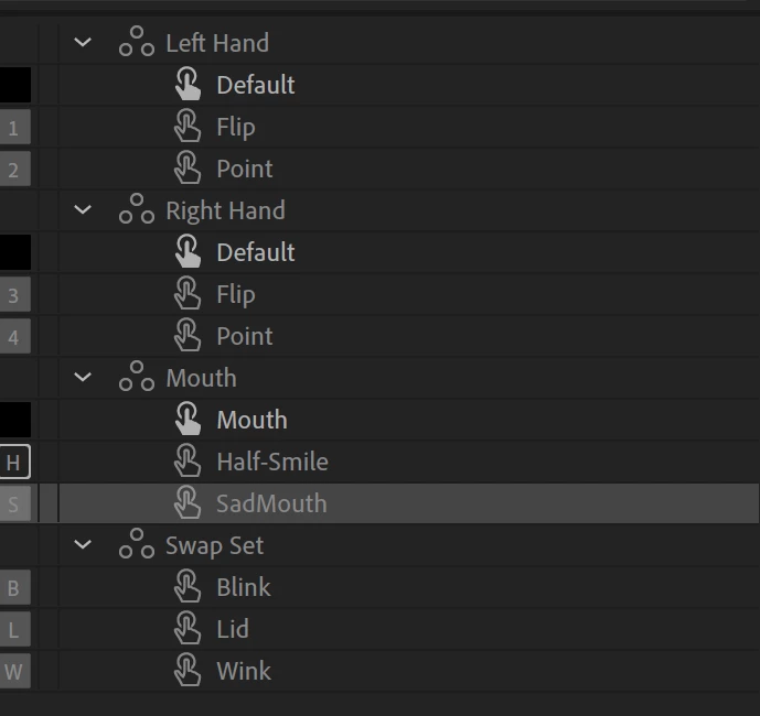 But, to make it more interesting, you can have multiple "Mouth" layers (e.g. when happy and sad) with multiple visemes in them. You might (cannot remember!) need multiple behaviors to control each Mouth group. Any layer name with the word "Mouth" in it gets tagged as a mouth layer (hence, avoid using "Mouth" in layers that do not include visemes. (Gotcha: "AltMouth" won't get tagged but "Alt Mouth" (with space) will get tagged.)