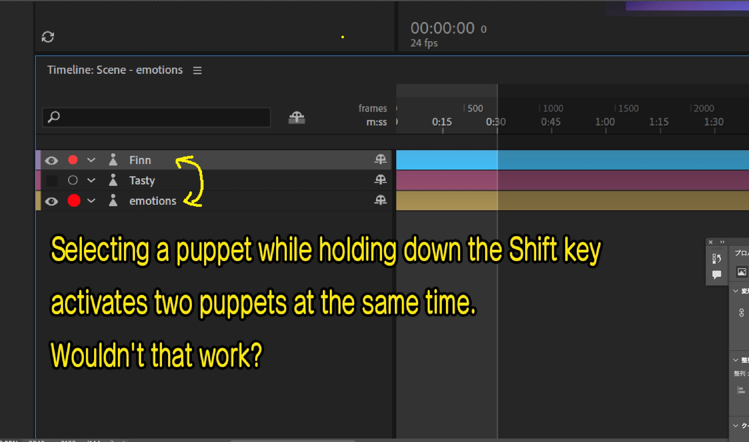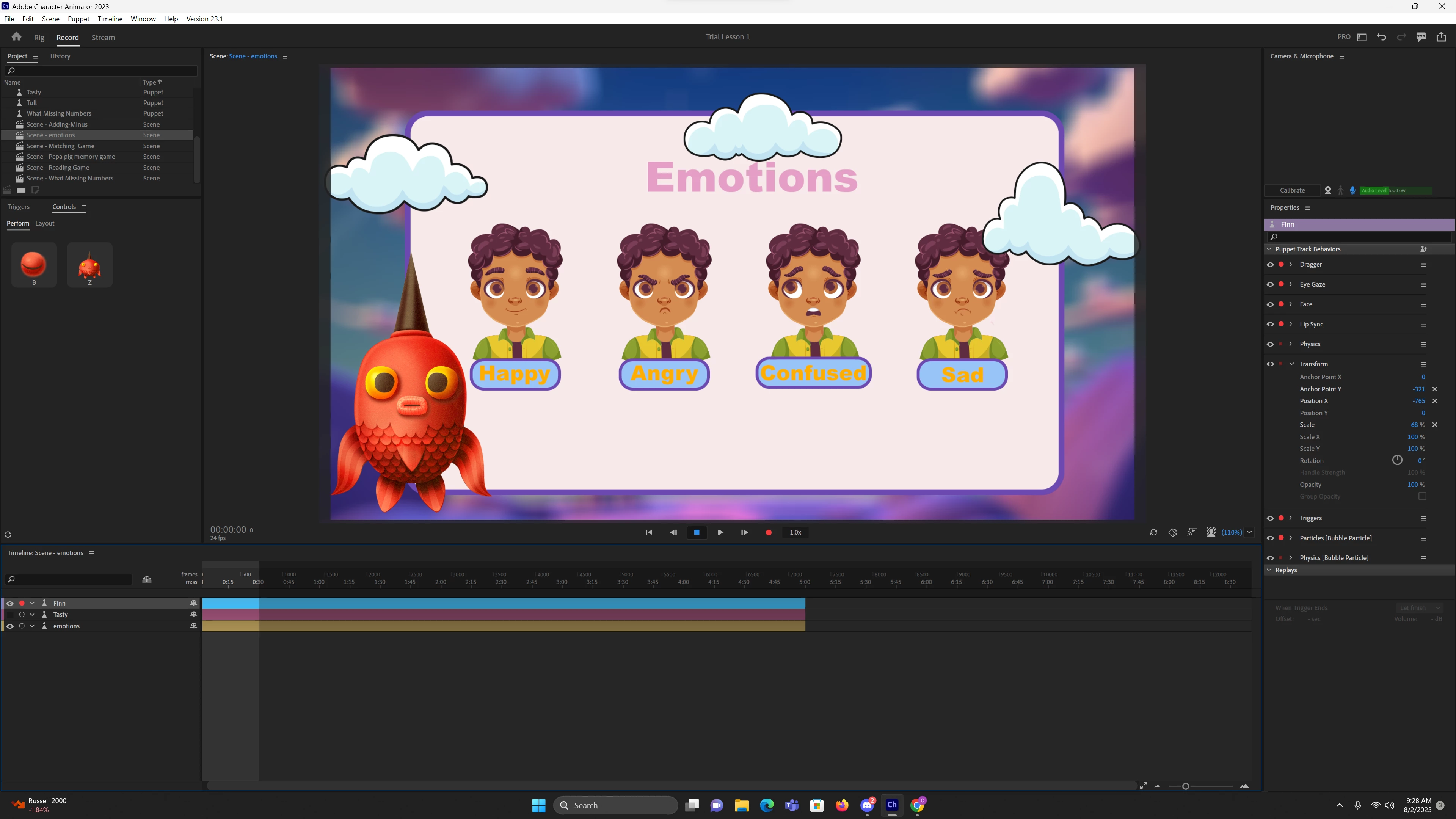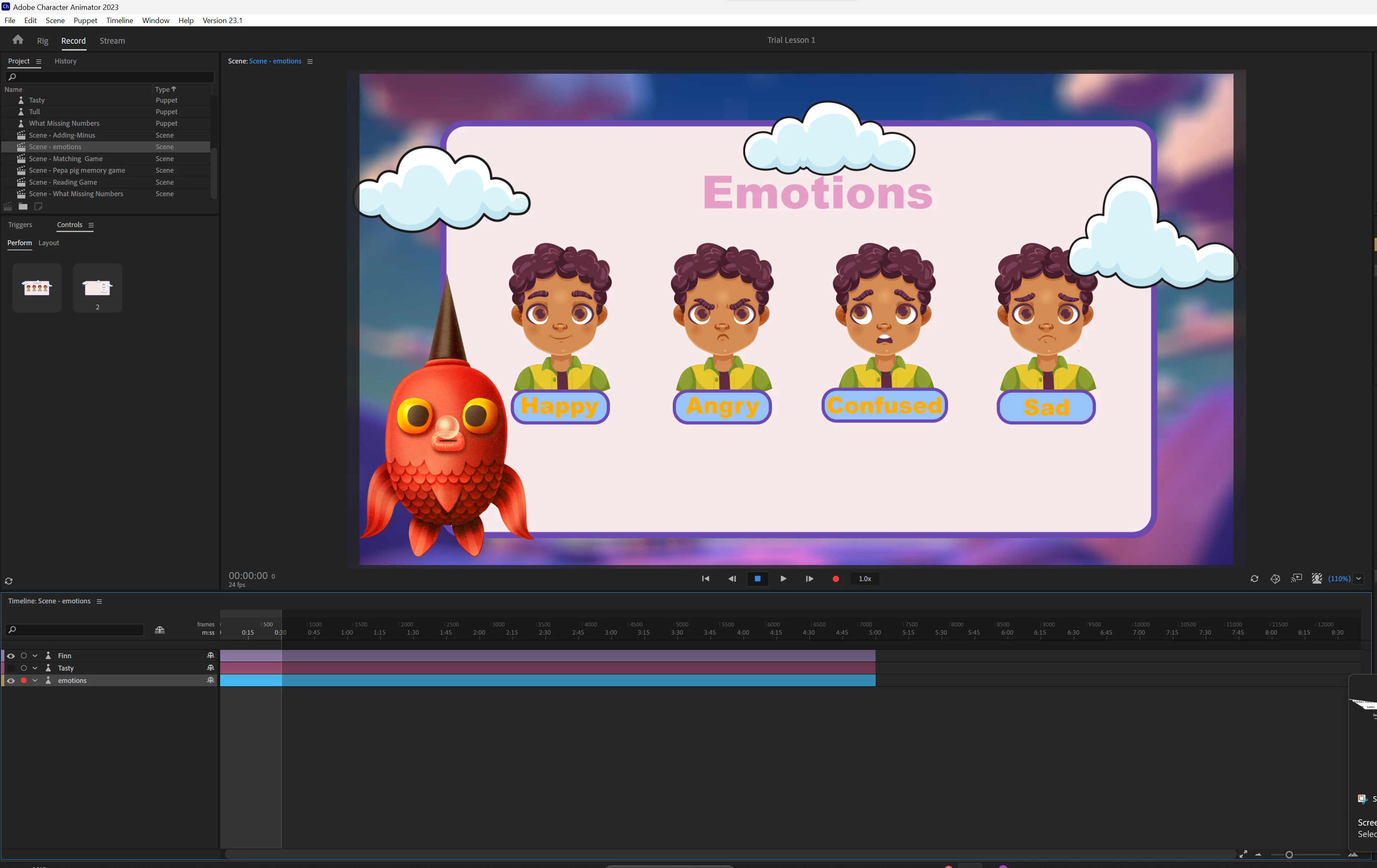 Hi, i am making a live class by using photoshop and charater animator and i am having some difficulties trying ti figure out something.As you can see in the pictures i attached when i select the scene called emotions i change it by using a swap set trigger which is 2 but when a select finn the fish the emotion trigger returns to it default swap set i tried seperating them by using normal triggers for the emotions but when i select finn they disappear.I know i can set the background(emotions) as sepearte psd files but i want them to be in one psd file beacuse im going the extend it and i dont want to have to many psd files .I tried my best to explain the situation i hope you understand what im trying to say thank you