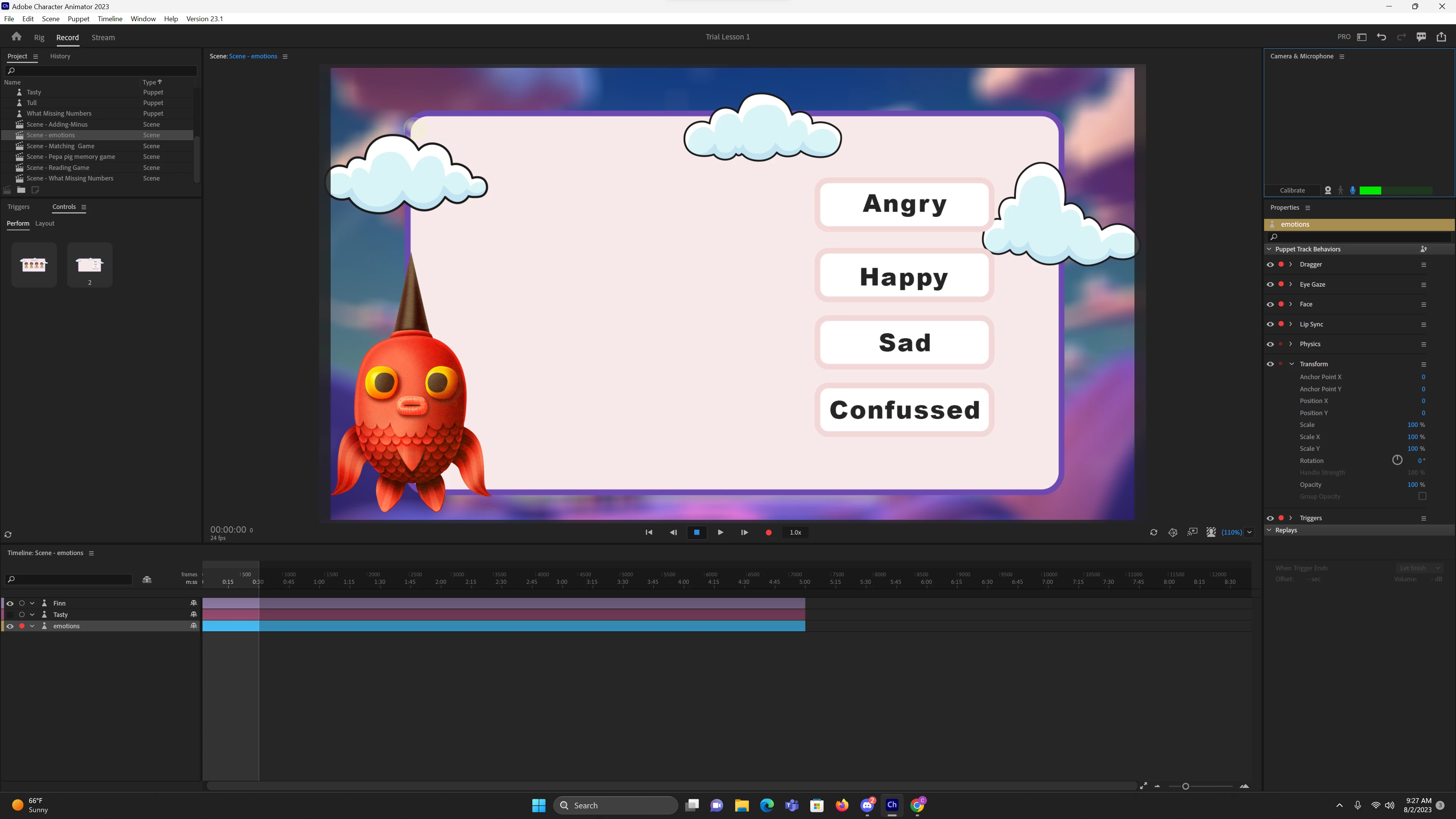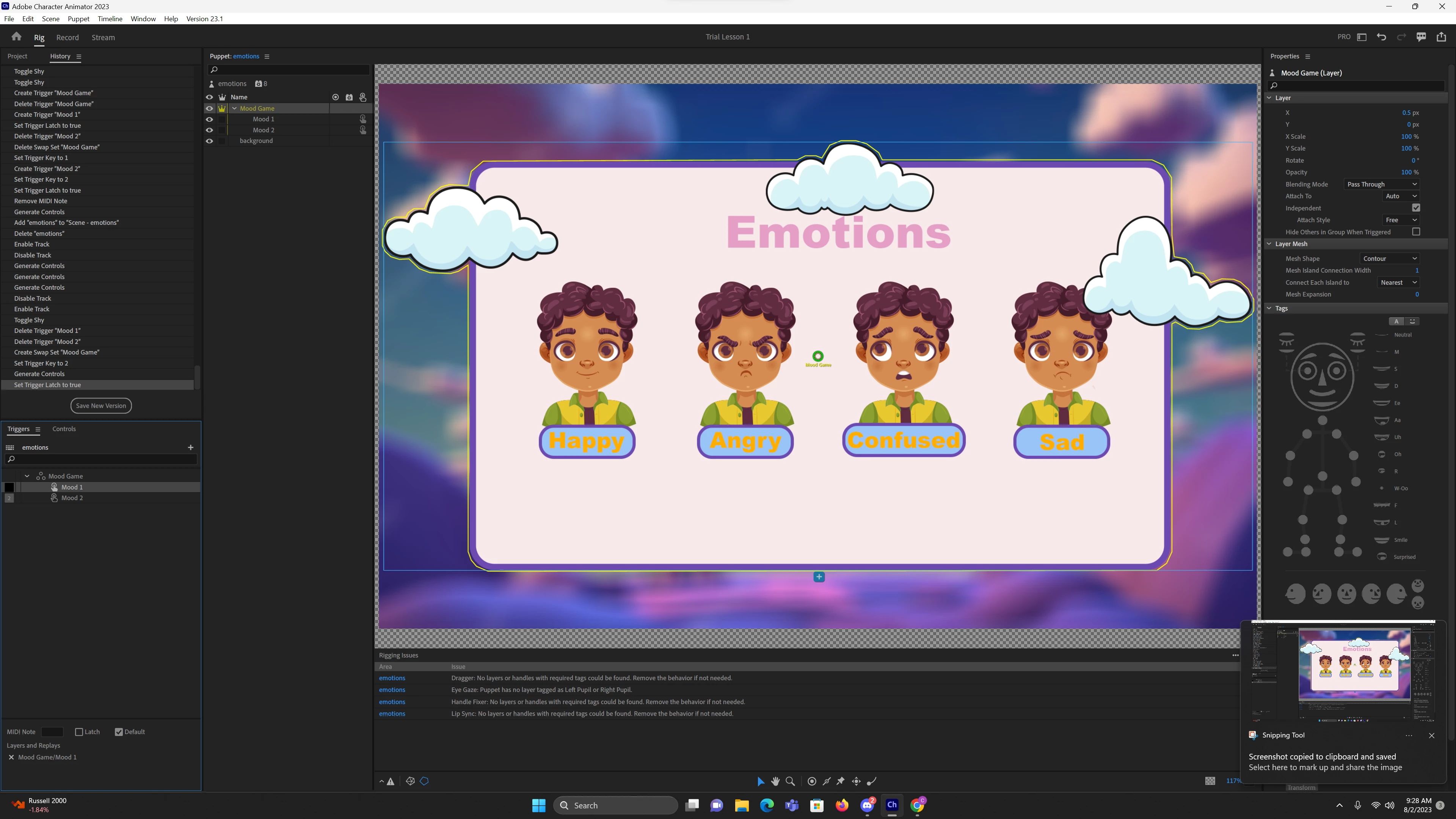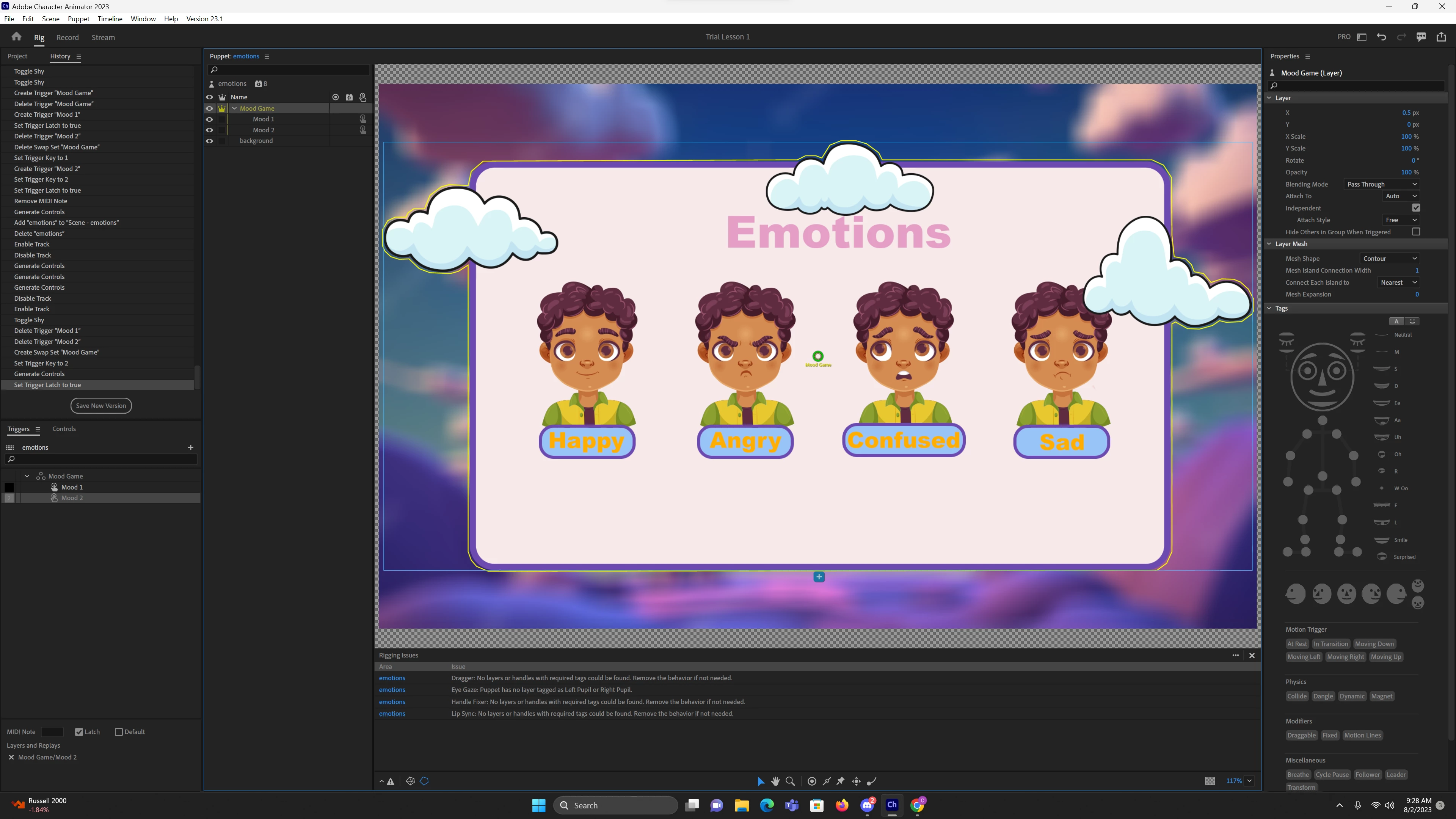 Hi, i am making a live class by using photoshop and charater animator and i am having some difficulties trying ti figure out something.As you can see in the pictures i attached when i select the scene called emotions i change it by using a swap set trigger which is 2 but when a select finn the fish the emotion trigger returns to it default swap set i tried seperating them by using normal triggers for the emotions but when i select finn they disappear.I know i can set the background(emotions) as sepearte psd files but i want them to be in one psd file beacuse im going the extend it and i dont want to have to many psd files .I tried my best to explain the situation i hope you understand what im trying to say thank you