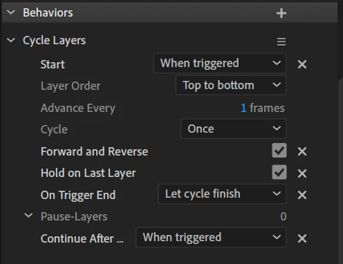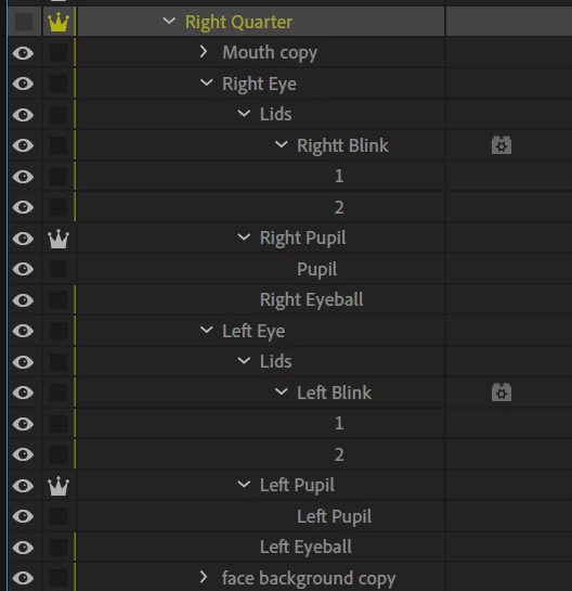 I'm having an issue with my puppet where the head turn to right quarter causes only the right eye to blink and stay shut. I can see the blink animation proceeding, but I'm not certain why the lid doesn't re-open. I don't have clearance to share the puppet, but here are the Cycle Layers settings. Any ideas would be welcome.