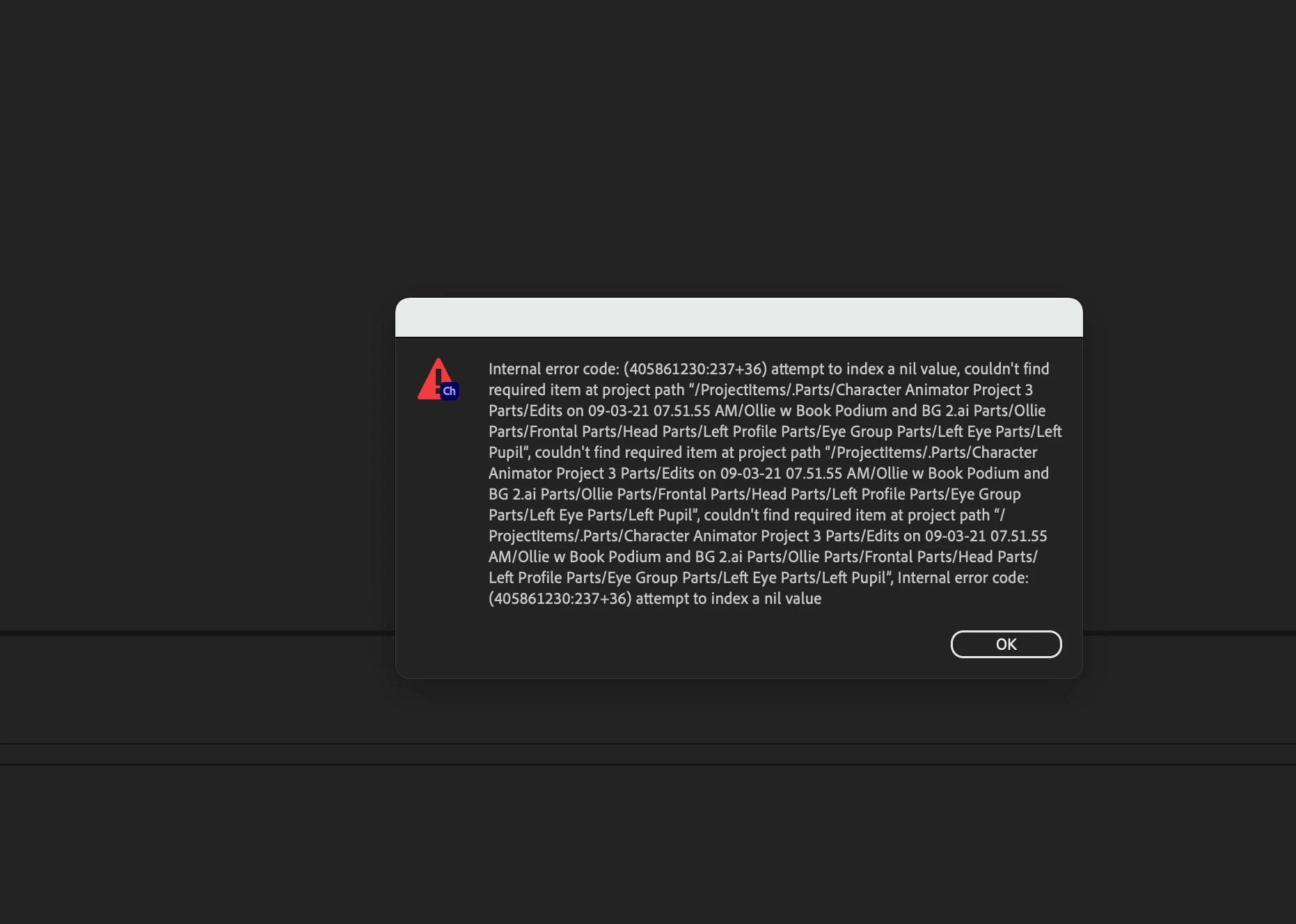 Update: i reverted back to a previous version of my project using the History tab. I no longer receive that error message and the artwork and scene seems to load. I can hear the audio but the scene is completely black.