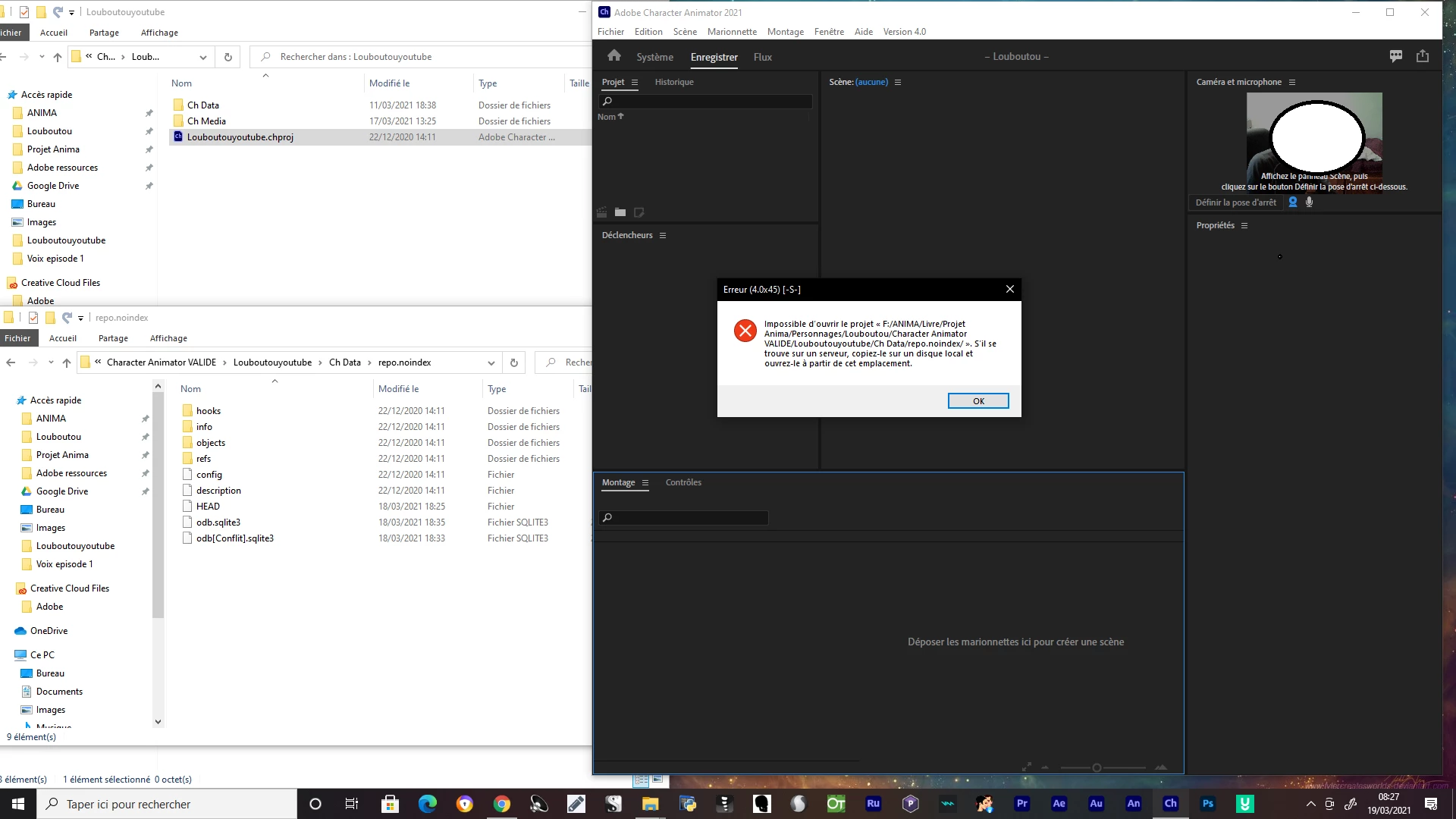 I worked on my project in Character Animator last night. I quit and this morning I open Character Animator and it shows me an error (sorry I have the software in French).