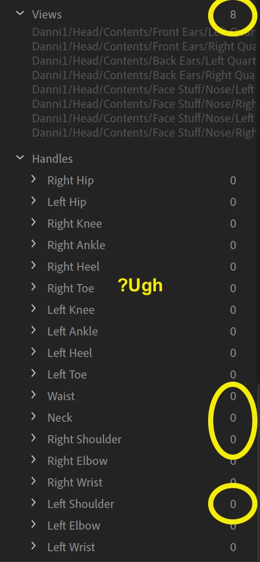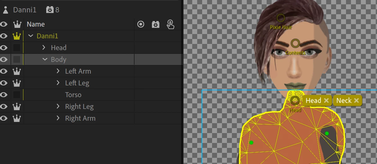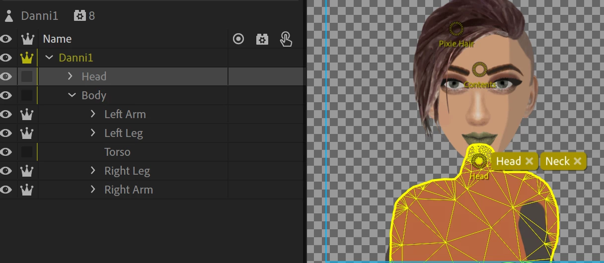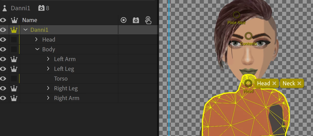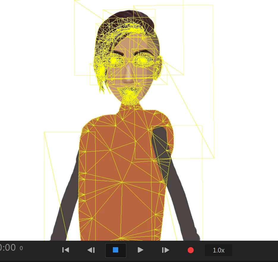 Then I noticed in Rig Mode, when I select the main character root or the head or the body, no mesh outline or mesh itself would show up for the head. But the mesh does appear for individual artwork inside the head and with the entire head in Record Mode. And all of the head's behaviors and Dangle physics work fine in Rec Mode. Is this one problem? Multiple problems? Not a problem and something I'm missing? Please and thanks!