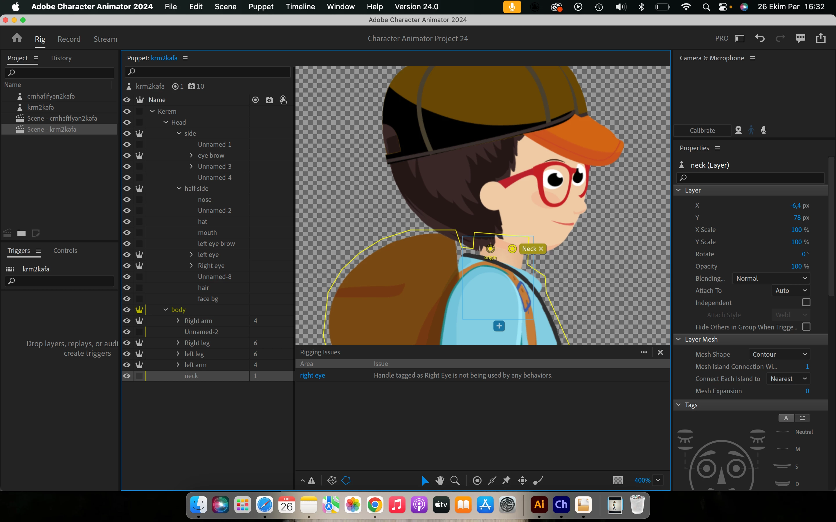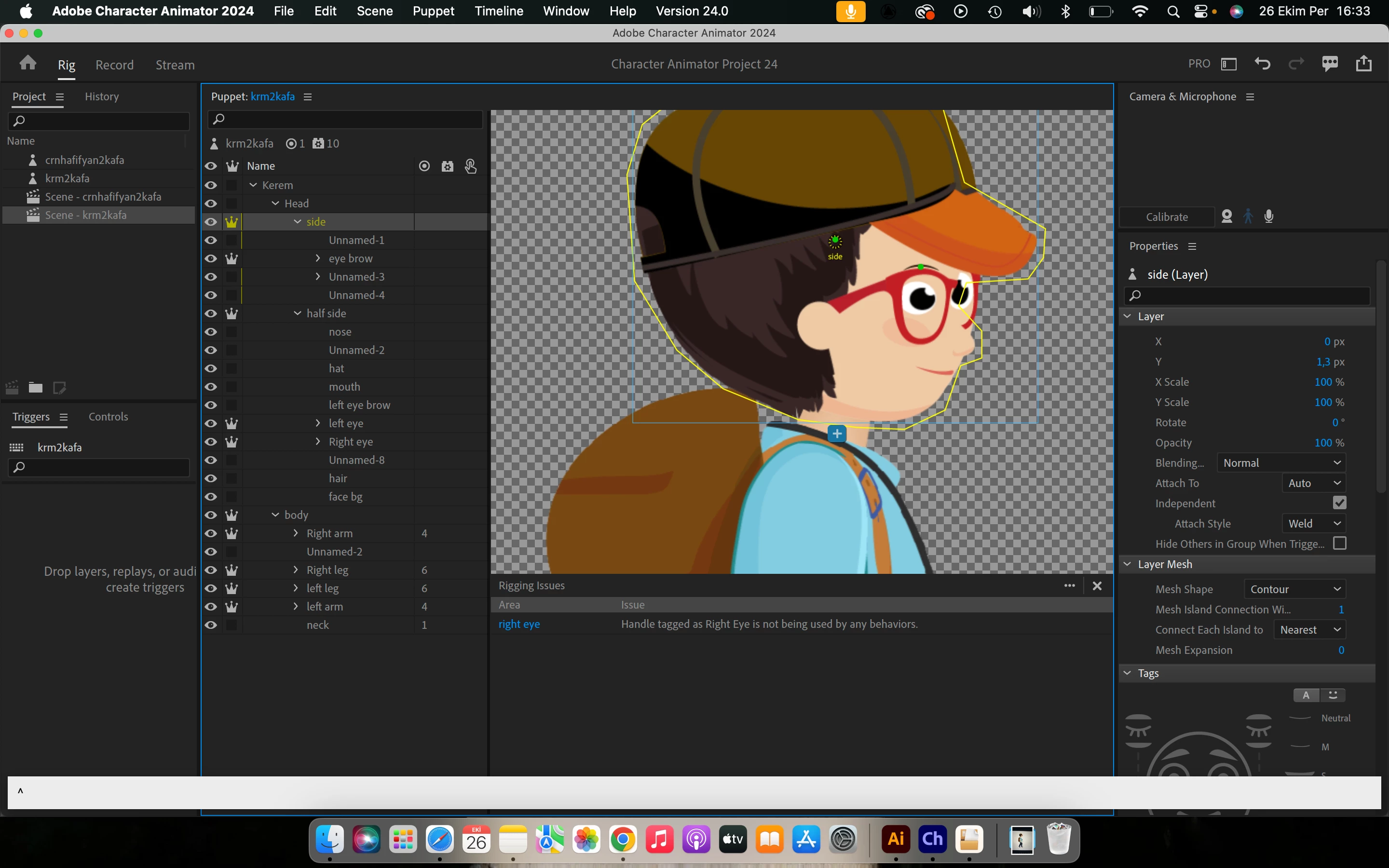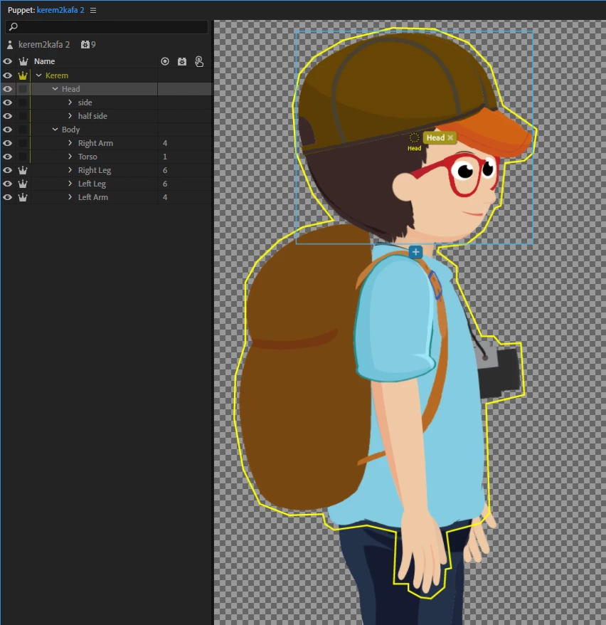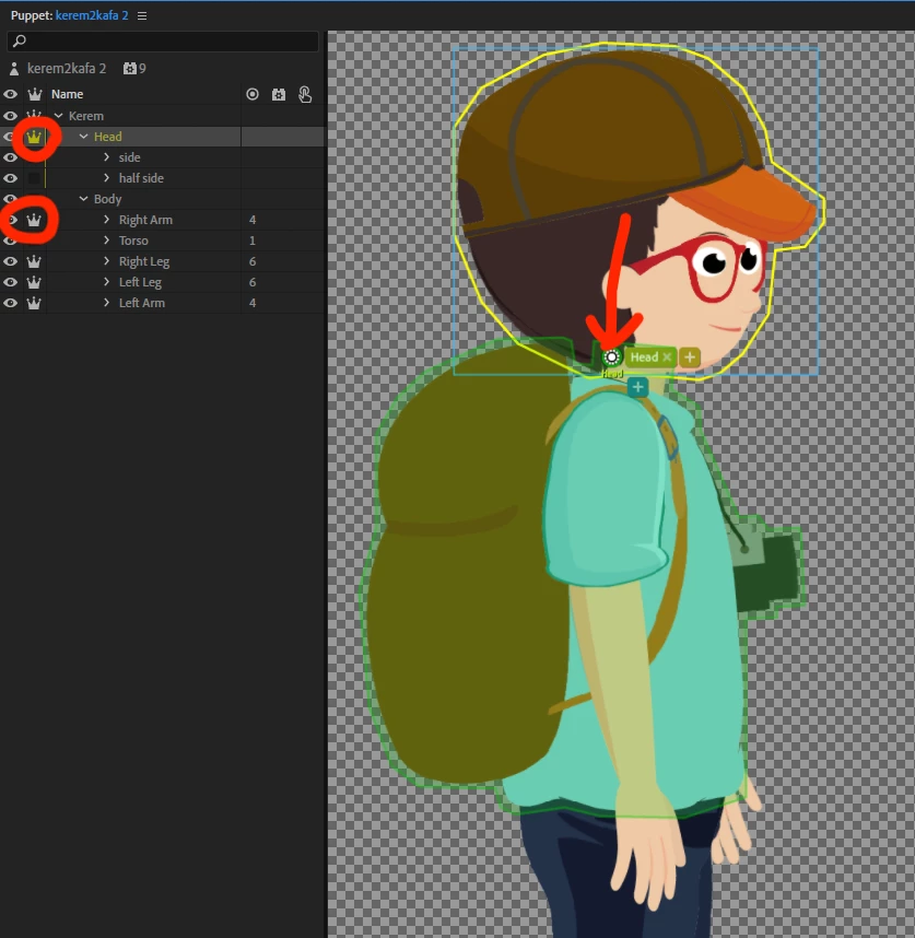 1. Make the "Head" and "Right Arm" layers independent (crowned) so they are treated as separate 2D images