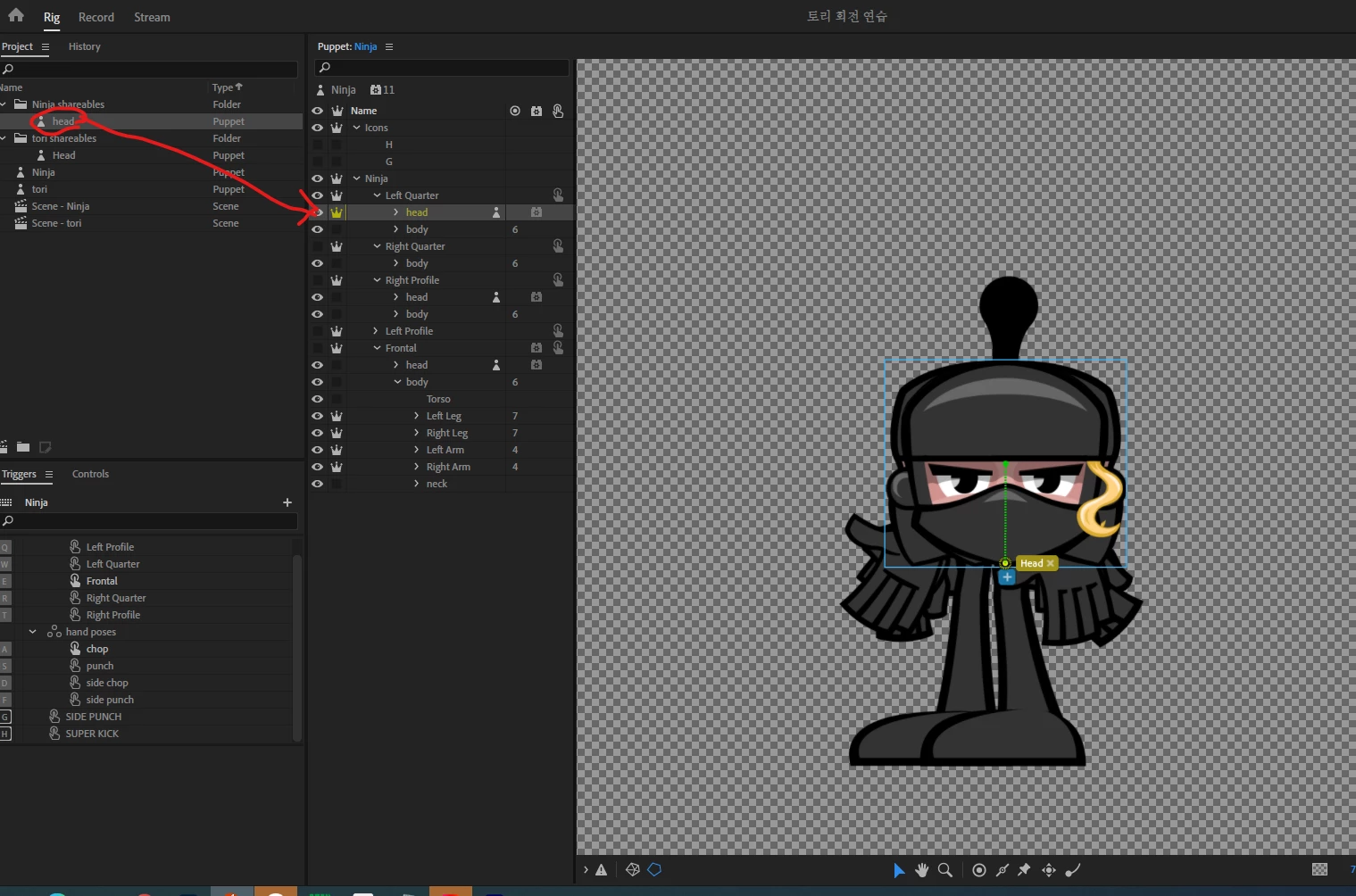 When I drag my head from the project panel and put it on the body, the head goes into the body chest, as shown in the picture below.