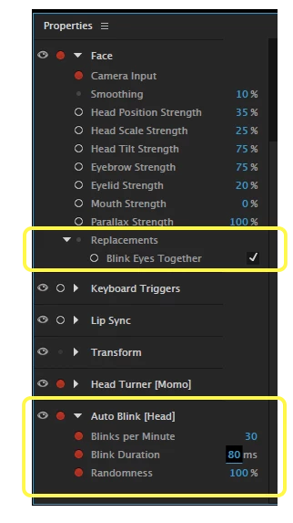 Here's what I've got set in the Properties panel. I figured the Camera Input blinks were coming from the "Face - Replacements - Blink Eyes Together" item, but that option isn't armed and I'm still getting camera blinks in addition to my auto-blinks. Is there another place I need to go to get the camera to disregard my blinks?