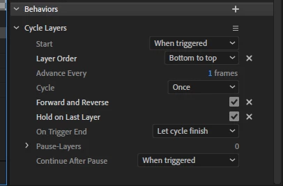 When adding the Cycle Layers behavior to the Left Quarter and Right Quarter positions, the layer order is important. Thankfully, there is an option to change the order the layers cycle from top to bottom to bottom to top. In my experience, the effect works best when the layers "advance every" 1 frame. Obviously, you only need it to cycle once unless your puppet is drinking a lot of coffee. The check boxes for "Forward and Reverse" and "Hold on Last Layer" also need to be checked. On Trigger End, let the cycle finish. And let it Continue After Pause when triggered.