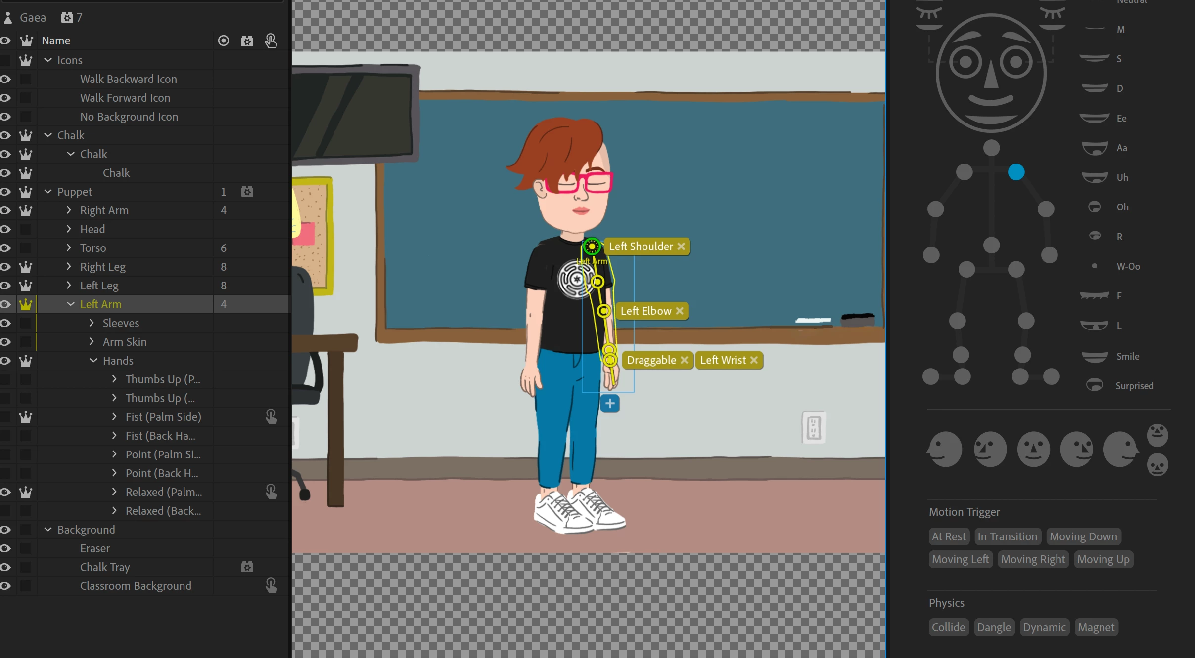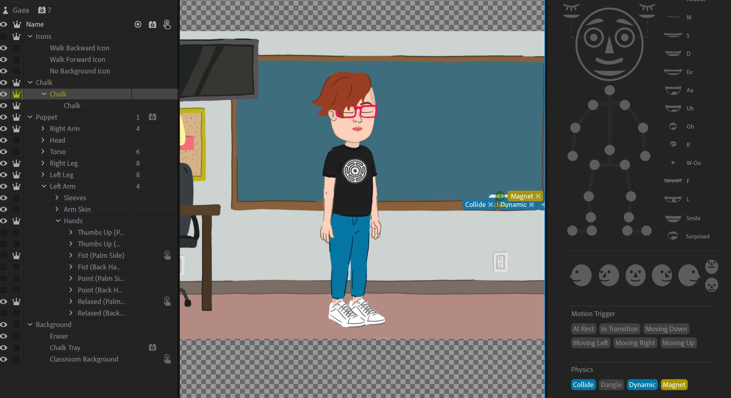 I am trying to get my character to pick up a piece of chalk. My puppet was one of the ones in the puppet library, so I didn't do the rigging myself, but I'm trying to learn based on watching videos and looking to see how this one is already rigged.