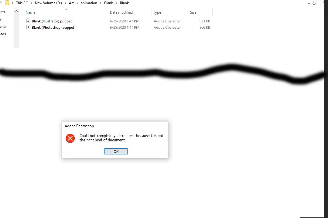Hello all. My issue is I can't open downloaded PSD puppet files in photoshop. When i do i get an error, which I'll post a picture of below. However, the example puppets work just fine in opening in photoshop. I've tried some file converters for the puppets but even the online converters say it'snot a supported file format. I'm curious how to open these files in photoshop, thanks! This issue is on windows btw