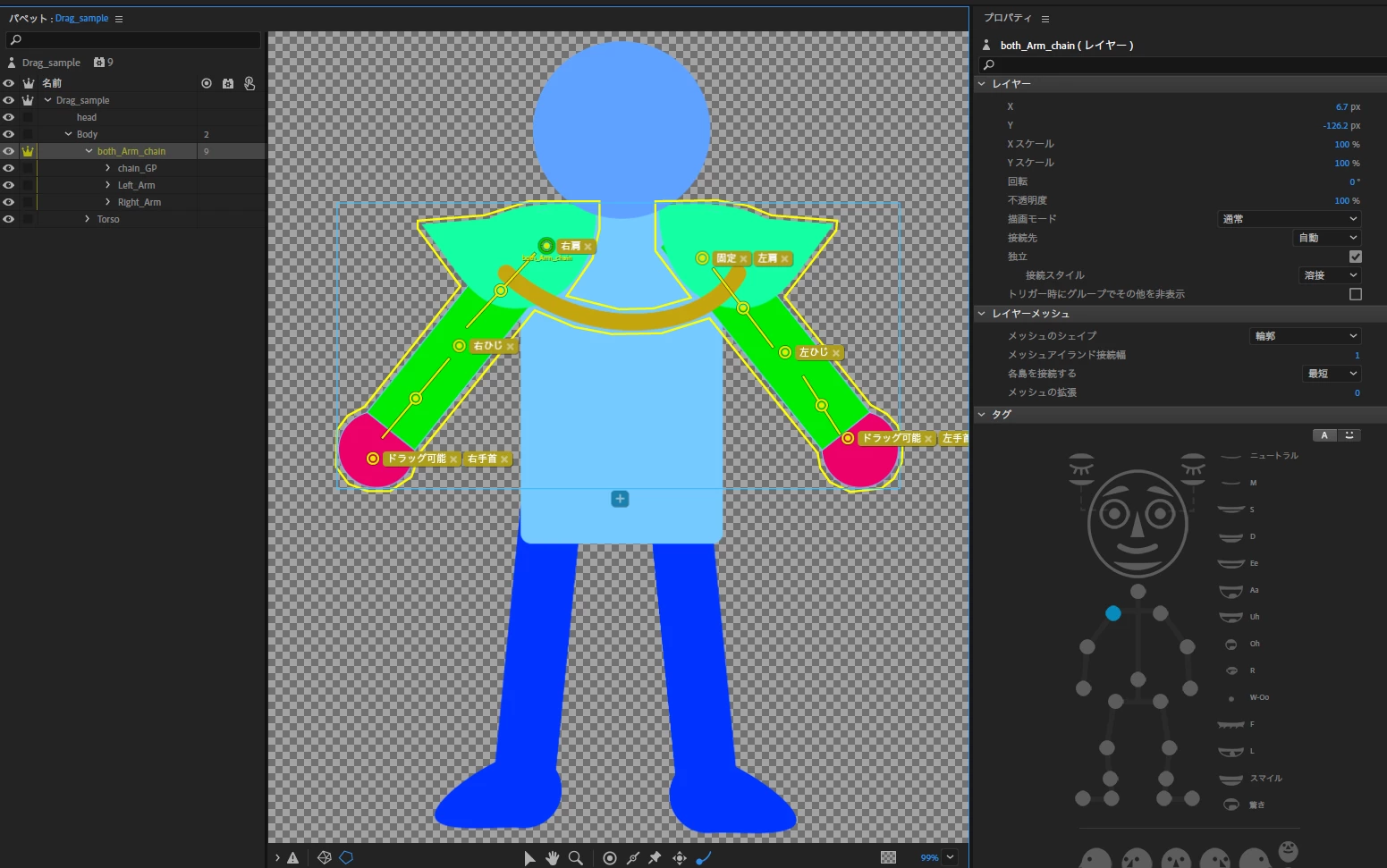 I have this puppet who has a gold chain connected to both its shoulders. I want each end of it to move along with each arm and dangle in the middle, without warping or breaking.